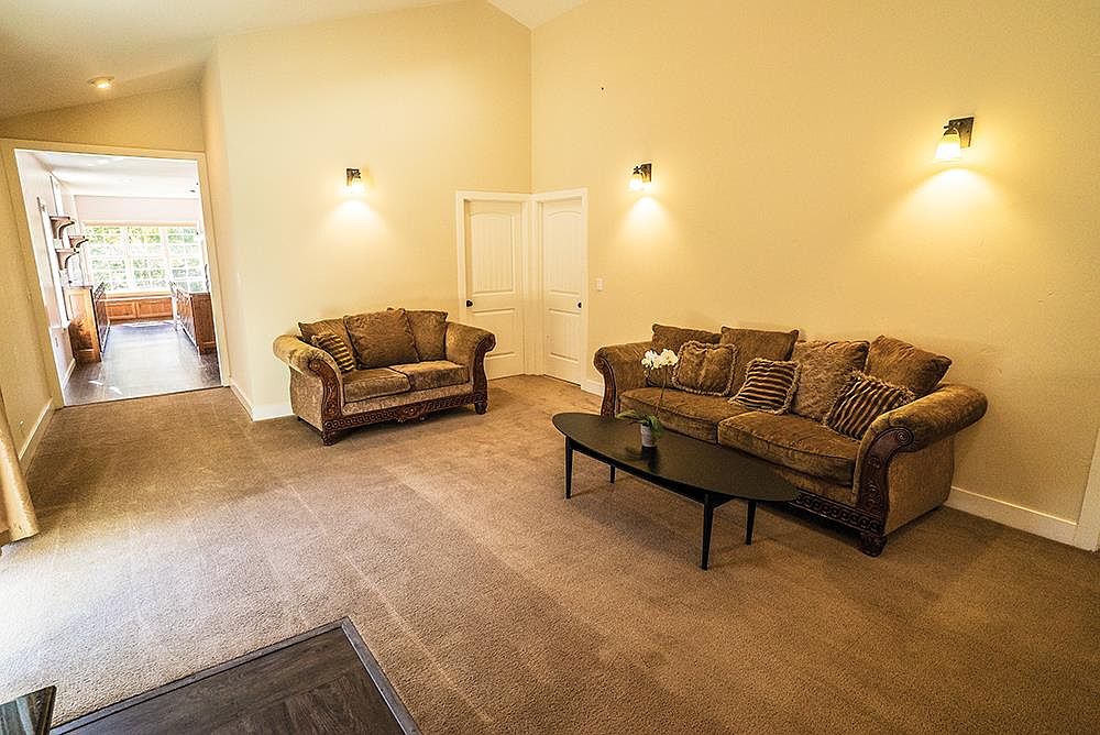 The living room features a spacious layout with a warm, earthy color scheme of beige walls and plush carpeting. Two ornate couches, embellished with intricate detailing and patterns, are positioned to encourage conversation. A sleek, oval coffee table sits centrally, adorned with a small vase housing white flowers. The room benefits from natural light filtering through an adjoining doorway that leads to a sunlit area with large windows. Sconce lighting on the walls adds a soft glow, enhancing the cozy atmosphere. Architectural details include crown molding, creating a refined finish, while the overall ambiance invites relaxation and comfort.