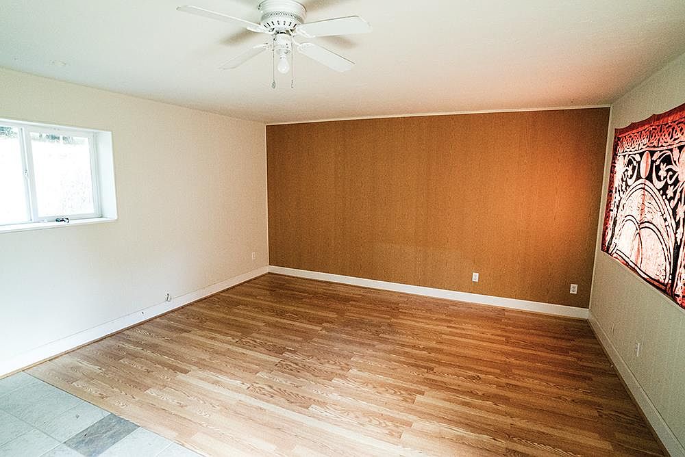This living room features a spacious layout with light wooden flooring that creates warmth. A large window on one wall allows natural light to stream in, enhancing the airy feel of the space. One wall is adorned with a warm-toned brown panel, adding visual interest and a touch of modernity. The ceiling is fitted with a simple white ceiling fan, ensuring ventilation. An intricately designed fabric piece hangs on another wall, providing a pop of color and texture. The neutral color palette of the walls complements the natural light, creating a calming environment that’s perfect for relaxation.