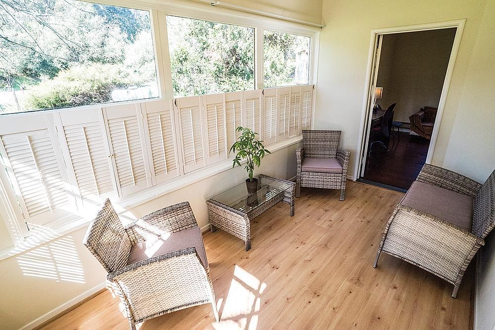 This sunroom combines warmth and relaxation, featuring two wicker chairs with soft cushions, arranged around a glass-top table. Natural light floods the space through large windows, casting patterned shadows onto the light wood floor. The walls are painted a soft cream, enhancing the airy feel. Shuttered windows allow for adjustable light control while providing a sense of privacy. A potted plant adds a touch of green to the room, promoting a refreshing atmosphere. The overall design harmonizes comfort and functionality, making it an inviting retreat for reading or enjoying peaceful views of the outdoors.