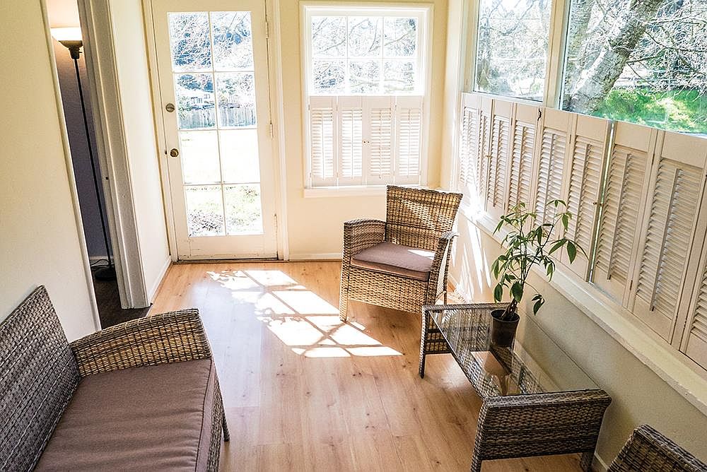 A charming sunroom captures natural light through expansive windows adorned with wooden shutters. The warm wood flooring complements the light-colored walls, creating a cozy atmosphere. Two rattan chairs with soft cushions, positioned around a glass coffee table, invite relaxation. A small potted plant adds a touch of greenery to the space. The room’s design reflects simplicity and comfort, with an inviting color palette of soft neutrals. The adjacent door hints at the connection to the main living area, enhancing the open feel. This sunroom serves as a peaceful retreat, ideal for enjoying morning coffee or quiet reading.
