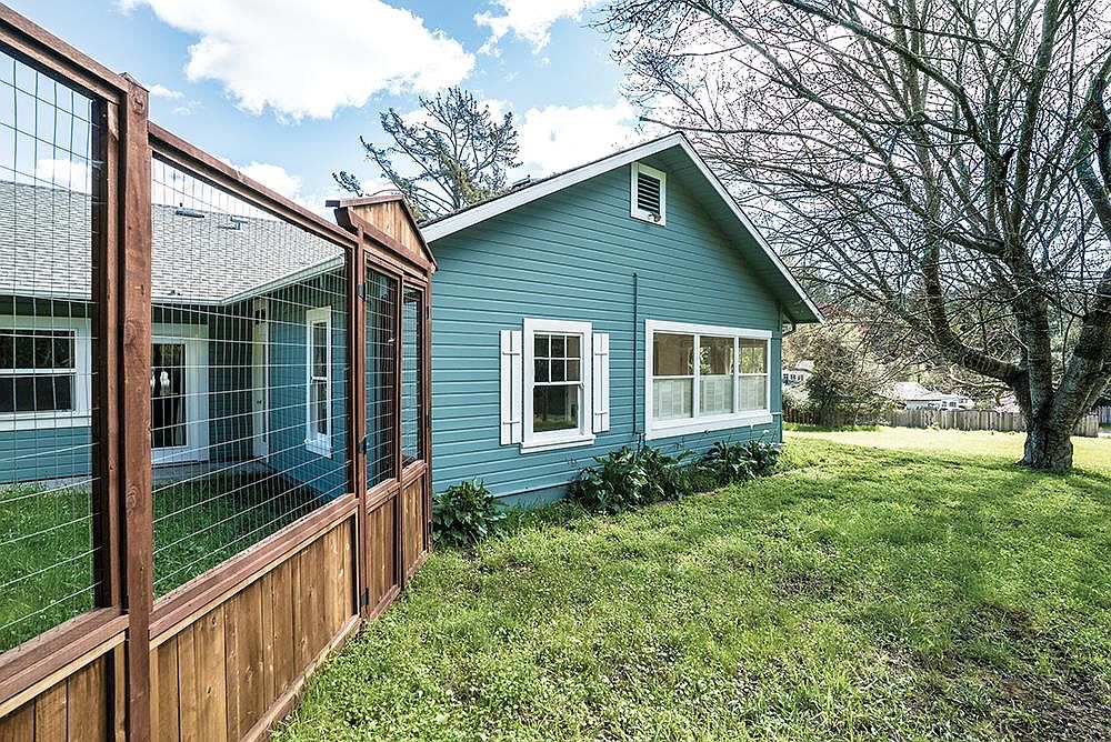 A charming historic home featuring a light blue exterior with white trim. The front presents multiple large windows, inviting natural light, while a set of steps leads up to a welcoming porch. The gabled roof adds character, and a stone chimney complements the overall design. To the left, a second structure extends from the main house, showcasing symmetry in architecture. Lush greenery surrounds the property, enhancing the sense of tranquility. A concrete pathway connects the entrance to the yard, which is spacious and well-kept, emphasizing the home’s inviting nature and its connection to the surrounding landscape.