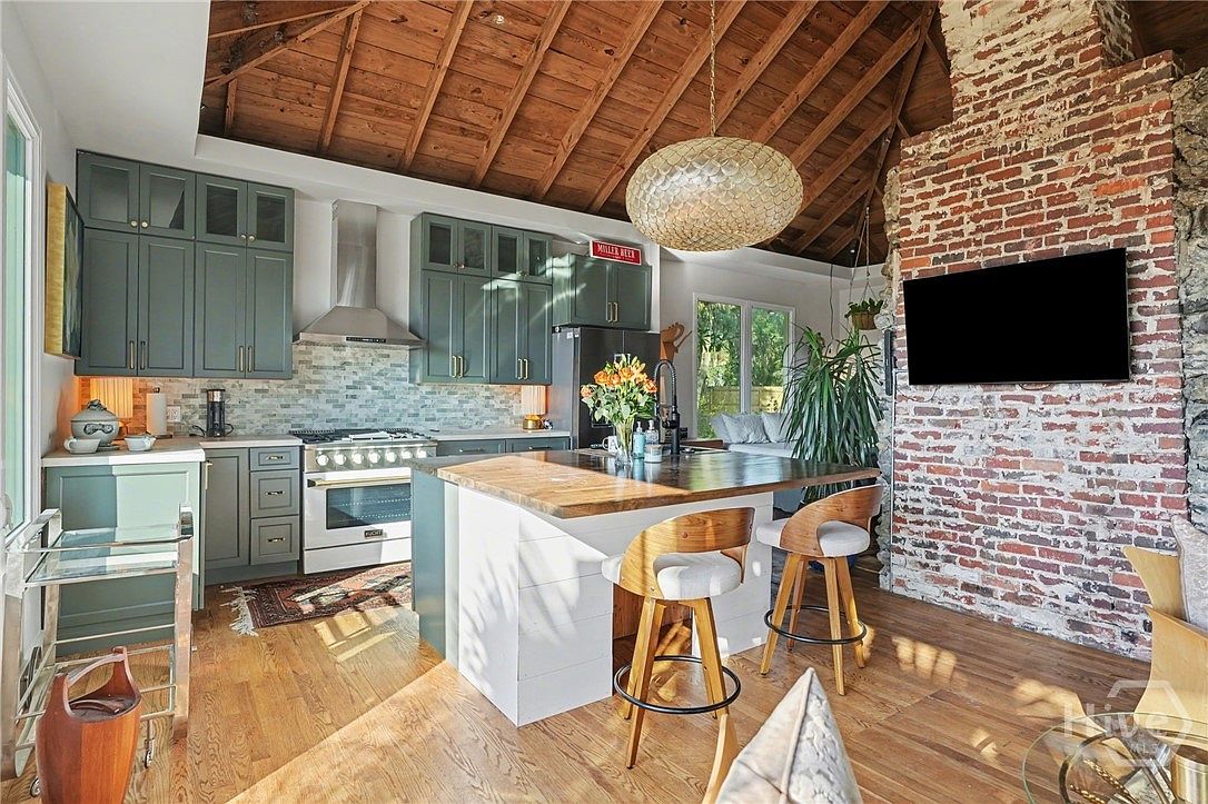 This kitchen features an open layout with wooden beams and a vaulted ceiling, enhancing the spacious feel. Rich blue-gray cabinetry provides a contemporary touch, complemented by matching hardware and a stylish backsplash of glass tiles. The centerpiece is a large wooden island topped with a smooth surface, inviting casual dining with its round stools. A cozy brick wall adds rustic charm, while large windows illuminate the space with natural light. Green plants add a lively touch, softening the aesthetic. Modern appliances harmonize the room, blending functionality with a warm, inviting atmosphere perfect for family gatherings.