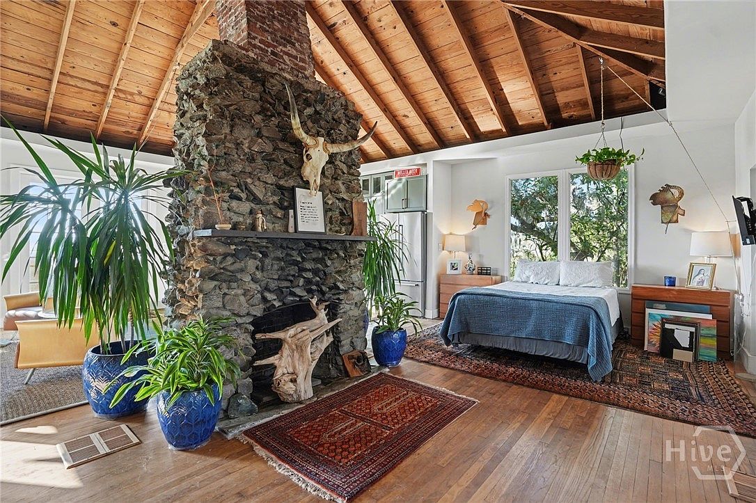 Cozy bedroom features a striking stone fireplace with a rustic wooden mantel, topped with decor and a skull, under a high, vaulted ceiling made of warm wood beams. The bed, draped in a stylish blue quilt, is positioned near large windows that invite natural light, revealing lush greenery outside. Richly patterned area rugs add warmth and texture to the hardwood floor. Surrounding plants in large blue ceramic pots enhance the natural ambiance, while modern wooden nightstands host lamps providing soft illumination. Art displays on the walls complement the rustic aesthetic, blending modern and traditional styles seamlessly.