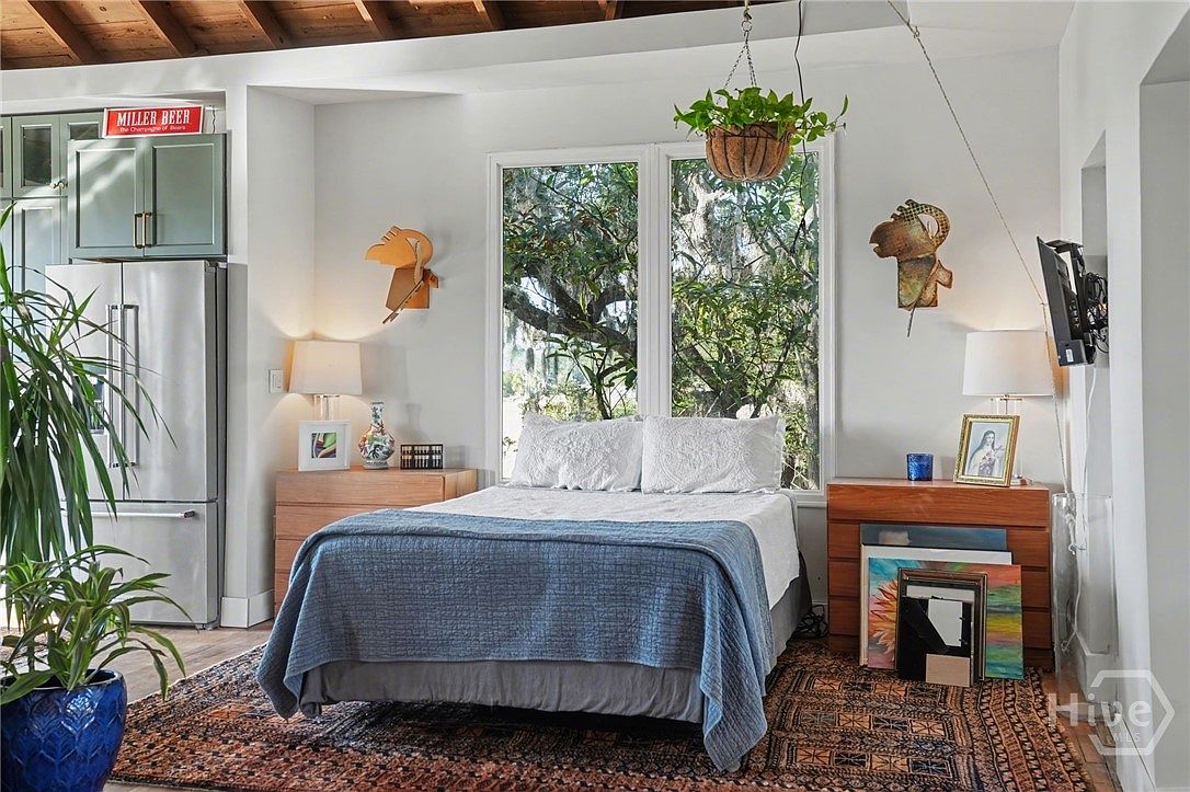 A cozy bedroom setup features a bed with a white textured comforter topped by a soft blue throw. Natural light floods in through large windows adorned with decorative greenery, bringing the outside in. The walls are painted a crisp white, enhancing the brightness. Adjacent to the bed, a stylish wooden nightstand holds a framed picture and a small blue glass, contrasting with the earthy tones of a patterned area rug beneath. A modern lamp offers additional lighting, while quirky wall art adds a playful touch. A stainless steel refrigerator peeks from the side, merging functionality with aesthetics.