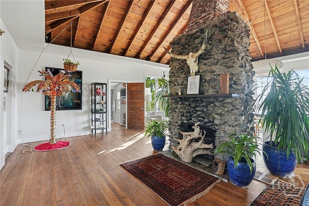 This spacious living room features a striking stone fireplace as its focal point, adorned with a mounted skull and a minimalist shelf above. The ceiling showcases rustic wooden beams, enhancing the room’s warmth. A vibrant palm plant installation hangs centrally, complemented by lush greenery in blue ceramic pots scattered throughout. The wooden flooring adds a natural texture, contrasting with a rich, patterned area rug beneath. Sunlight pours in through large windows, creating an inviting atmosphere. Adjacent doors lead to other spaces, while modern artworks provide a contemporary touch, balancing the historic elements of the home.