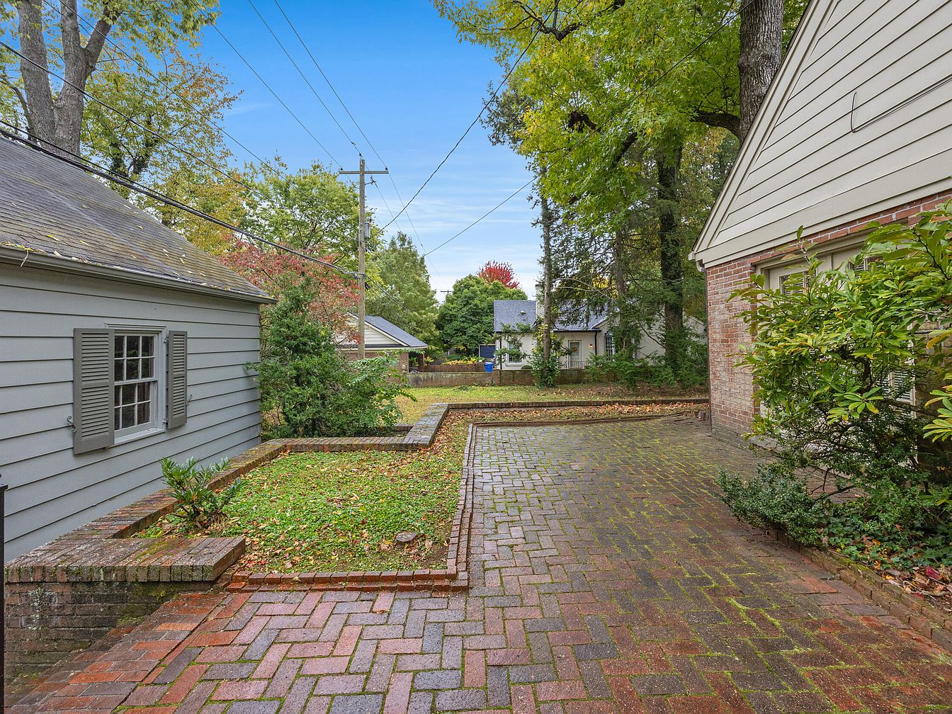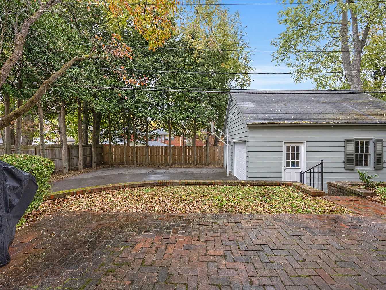 This image showcases the backyard area of a historic American home. A charming gray exterior building sits prominently, featuring white trim and shutters. The structure includes a staircase leading to a small landing, providing access to an elevated entrance. Surrounding the building, a paved patio with an intricate brick pattern is evident, complemented by patches of lush greenery. Tall trees create a natural privacy screen, while a wooden fence marks the boundary. The scene is adorned with scattered autumn leaves, enhancing the seasonal feel. This inviting space offers a mix of rustic charm and practicality.