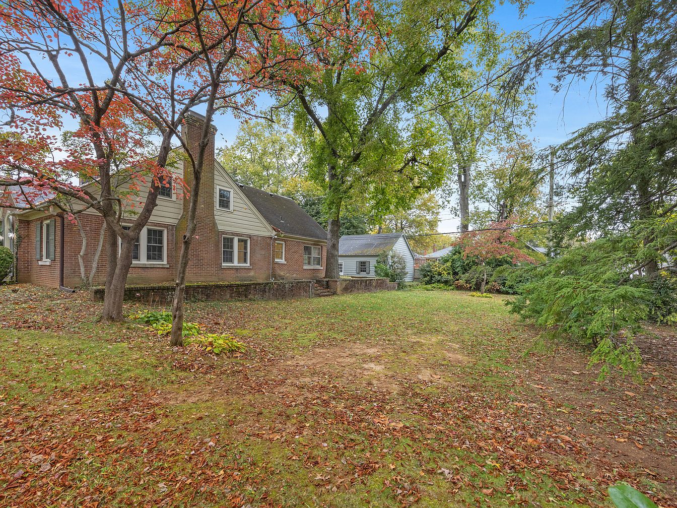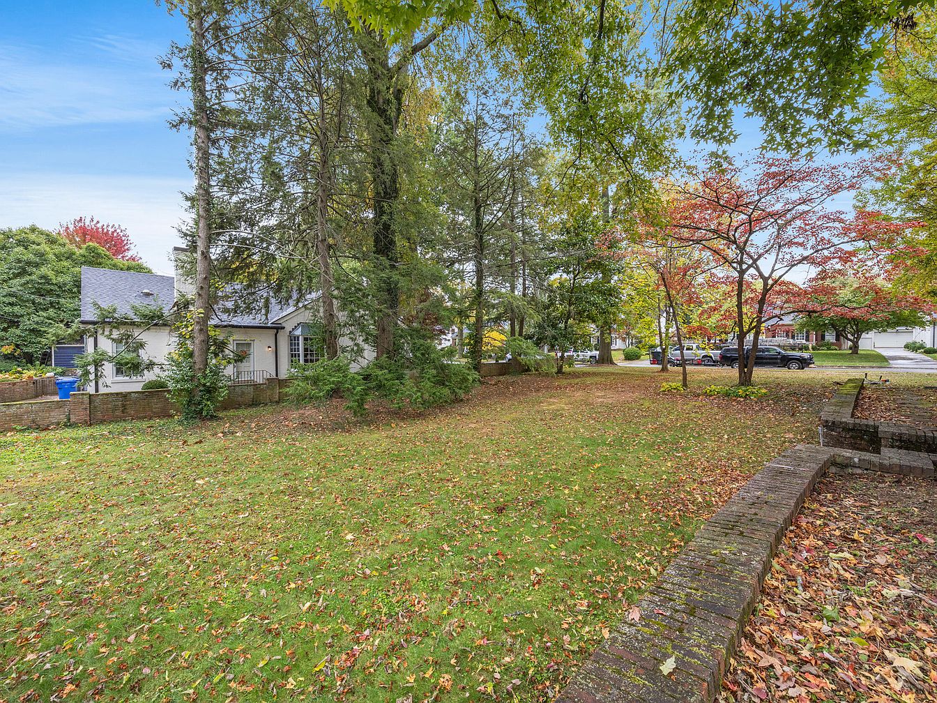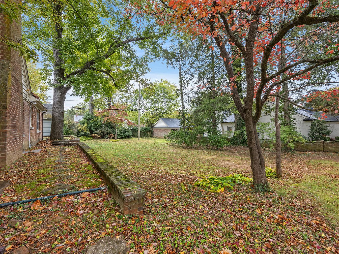 This spacious backyard features a serene expanse of lawn bordered by mature trees displaying autumn foliage, offering hints of red and gold. A brick retaining wall outlines a winding stone path, slightly overgrown with moss, leading towards the lush, green grass. The setting combines natural beauty with a rustic feel, accentuated by the scattered fallen leaves adding a vibrant splash of color to the ground. Nearby, clusters of shrubs and a small plant bed introduce variety to the landscape. The backdrop showcases a mix of residential structures, suggesting a tranquil neighborhood atmosphere.