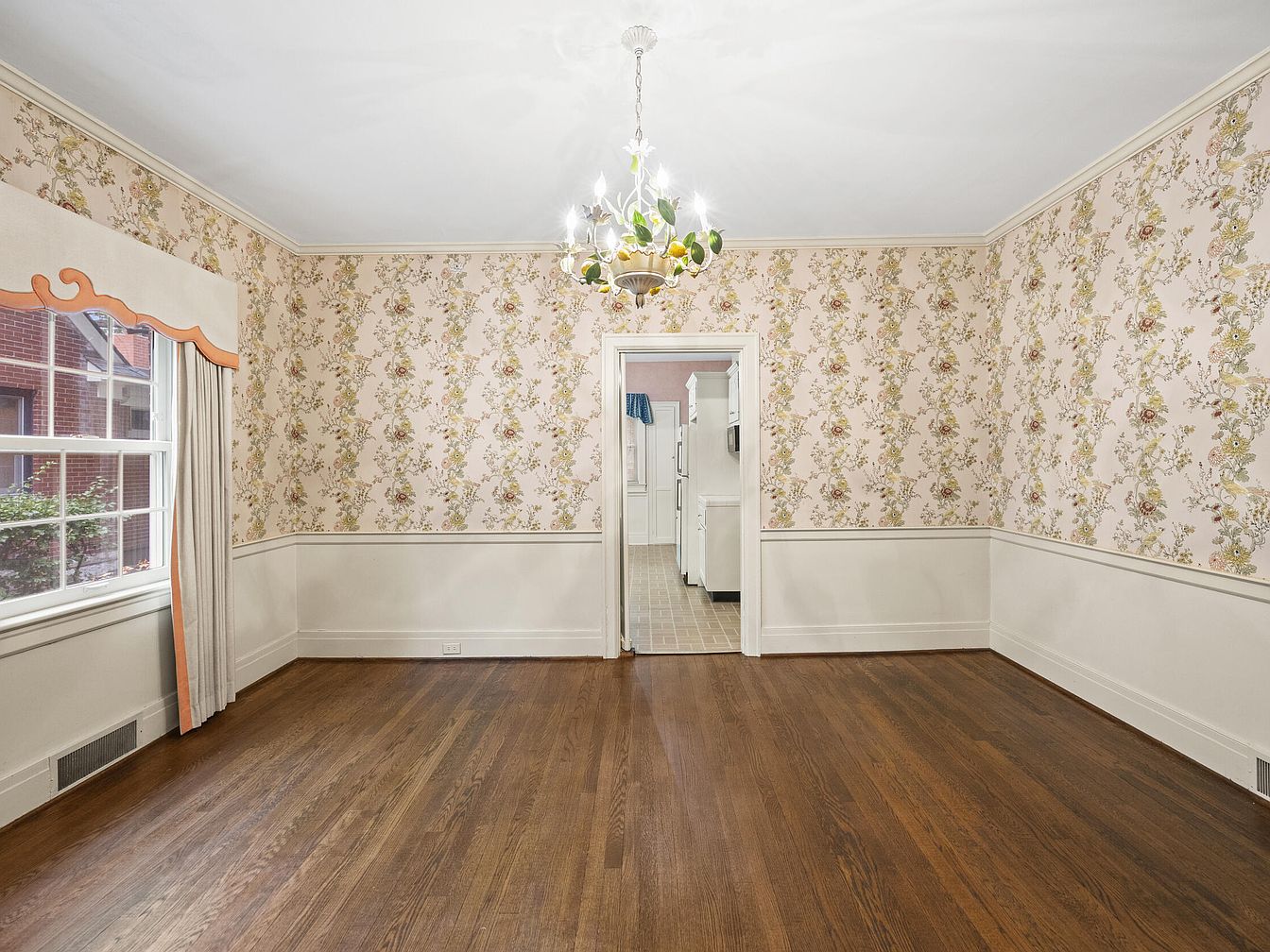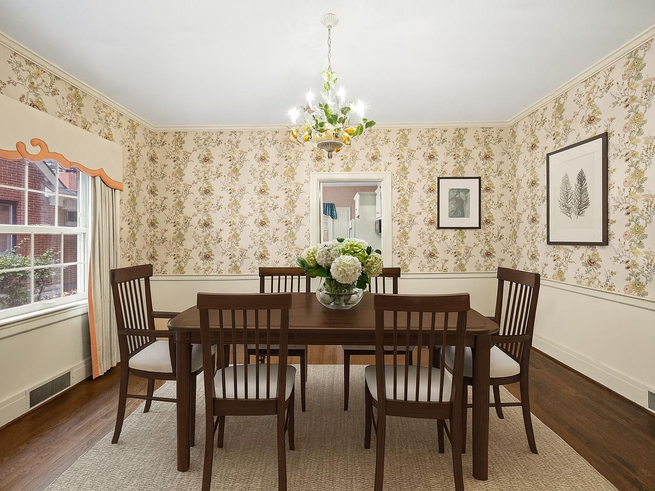 This dining room features a classic design with floral wallpaper in soft pastel shades, exuding a vintage elegance. The room is anchored by rich, dark hardwood flooring that contrasts beautifully with the lighter wall tones. An ornate chandelier with greenery accents hangs from the ceiling, providing both illumination and charm. White wainscoting adds a touch of sophistication to the lower walls. To the side, large windows with light-colored drapery allow natural light to fill the space, enhancing the airy feel. A doorway leads into the kitchen, integrating the two spaces while maintaining their individual character.
