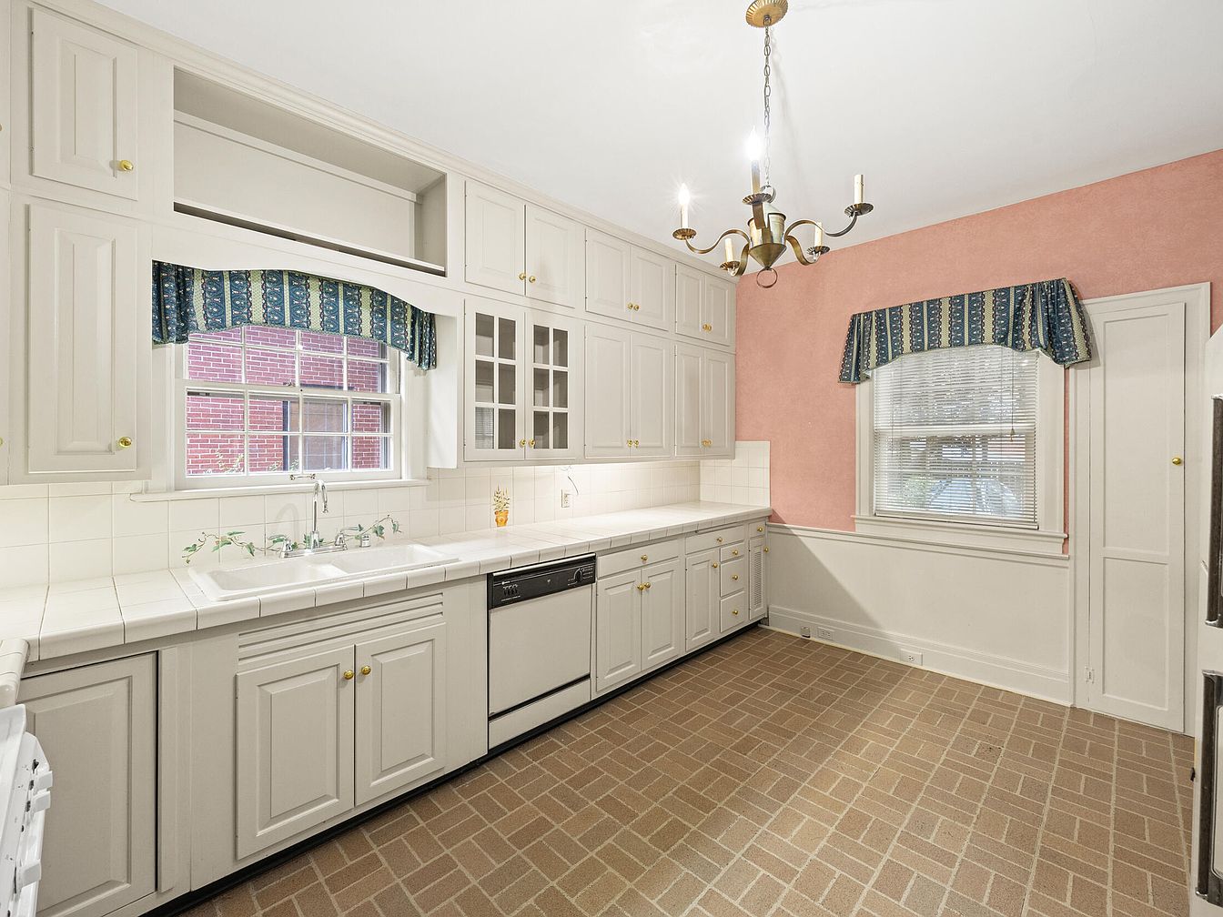 The kitchen features a spacious layout, highlighted by pale gray cabinetry that complements the warm beige tile flooring. A large counter runs along one wall, showcasing an integrated sink and modern appliances, including a dishwasher. Above the counter, a charming window dressed with a blue and green patterned valance allows natural light to illuminate the space. The walls blend a soft pink hue with white wainscoting, adding a cozy, inviting atmosphere. A vintage chandelier with golden accents hangs from the ceiling, enhancing the traditional aesthetic. Overall, the kitchen harmonizes functionality with classic design elements.