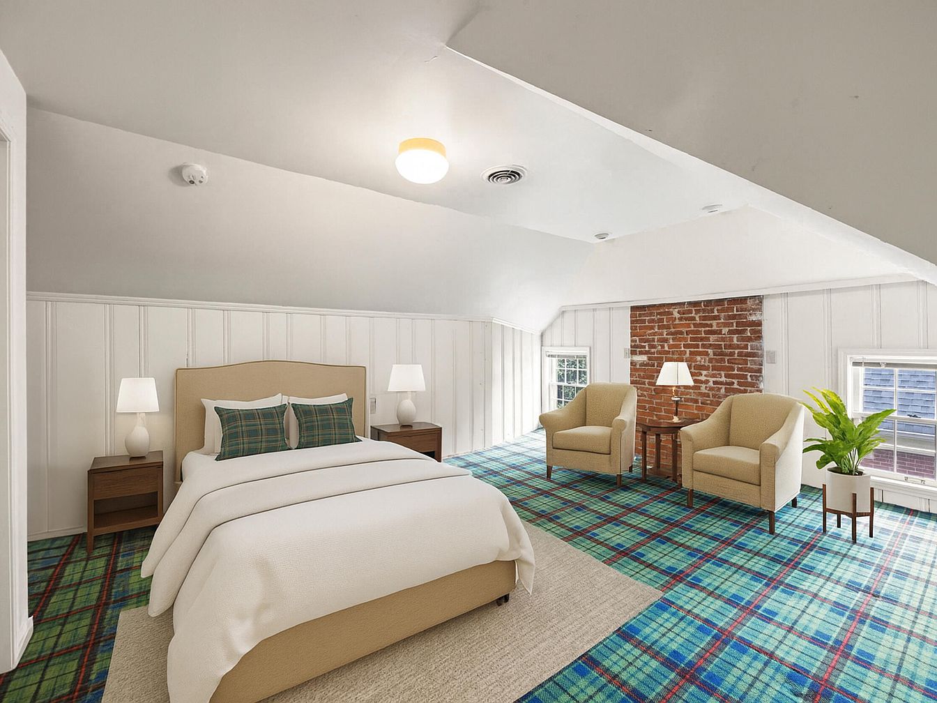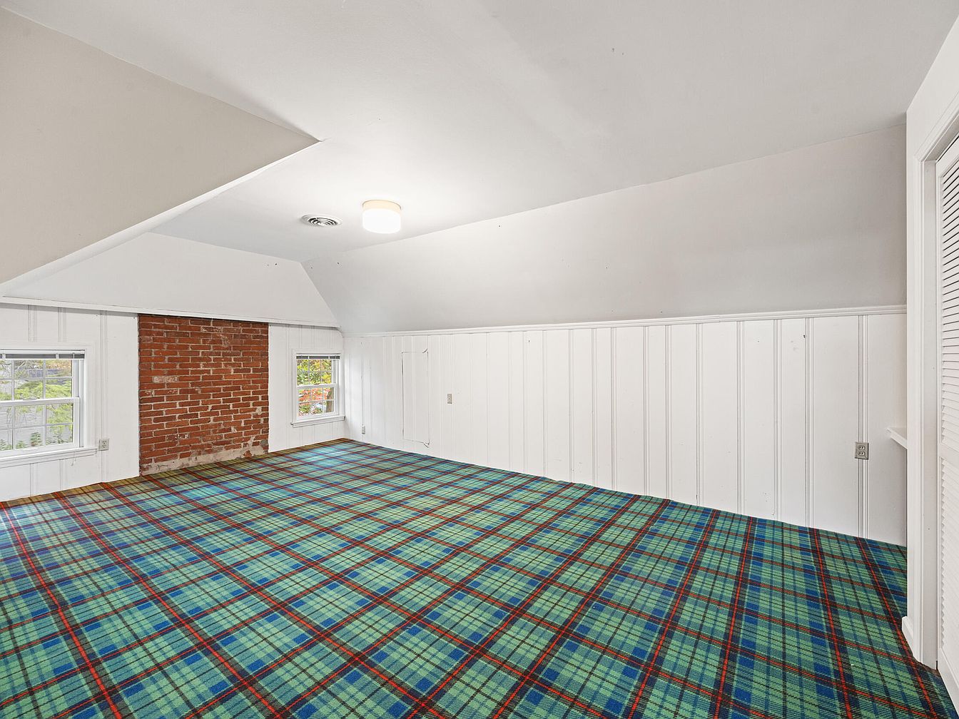 A spacious attic room showcases a unique charm with sloped ceilings, enhancing its cozy atmosphere. Light-colored walls contrast against a striking exposed brick feature, adding rustic warmth. The floor is covered in a vibrant plaid carpet of blue, green, and red hues, creating a playful yet inviting feel. Natural light streams in from two small windows, illuminating the room and offering glimpses of the outdoor scenery. Simple architectural lines and the absence of clutter emphasize the room’s openness and potential, making it a perfect blank canvas for various uses, from a creative studio to a cozy retreat.
