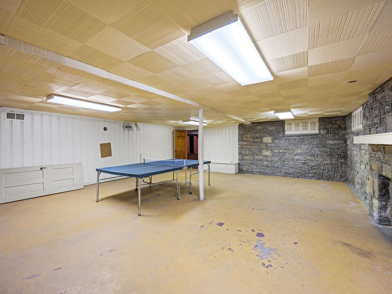 A spacious basement designed for recreational activities, featuring a simple layout with a prominent blue ping pong table at the center. The ceiling showcases a unique patterned design in light beige, complemented by bright fluorescent lighting that illuminates the entire space. The floor is finished with a patchy yellow surface, reflecting wear over time. White paneling on one wall contrasts with the rustic, textured stone wall on the adjacent side. An old door leans against the wall, hinting at past renovations. The room exudes a casual, multipurpose atmosphere suitable for leisure and gatherings.