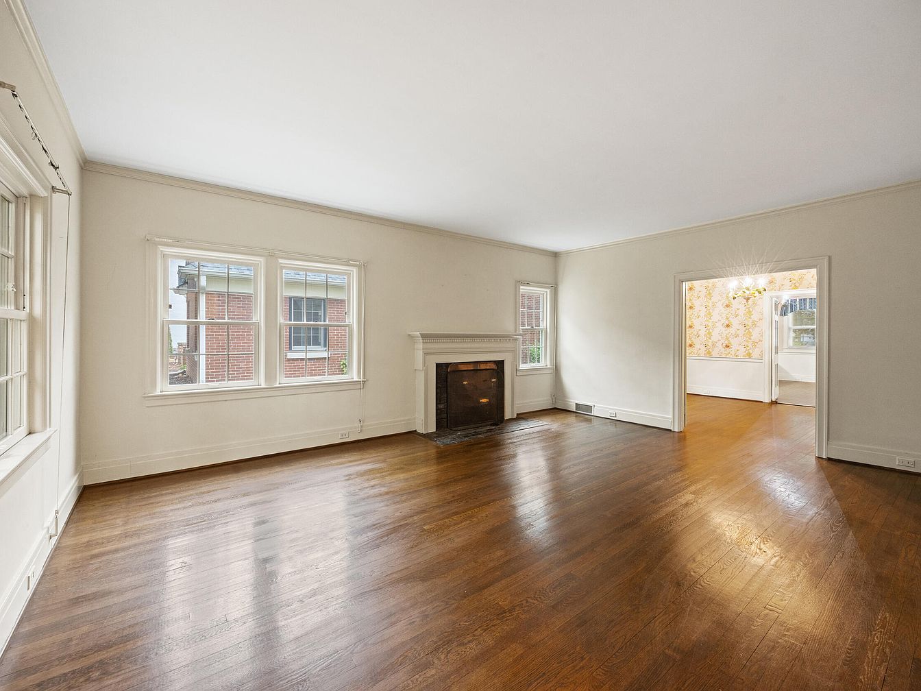 This spacious living room features warm wooden flooring that gleams under natural light from large, multi-pane windows. A traditional fireplace with a simple mantelpiece serves as a focal point against the light-colored walls. Architectural details include crown molding, enhancing the room’s elegance. The floor plan offers open connectivity to adjacent spaces, with a charming doorway leading to a floral-patterned wallpapered room in the background. Neutral tones dominate the palette, providing a calming atmosphere, while the harmonious blend of classic design elements evokes a timeless charm, suitable for both cozy gatherings and refined entertaining.