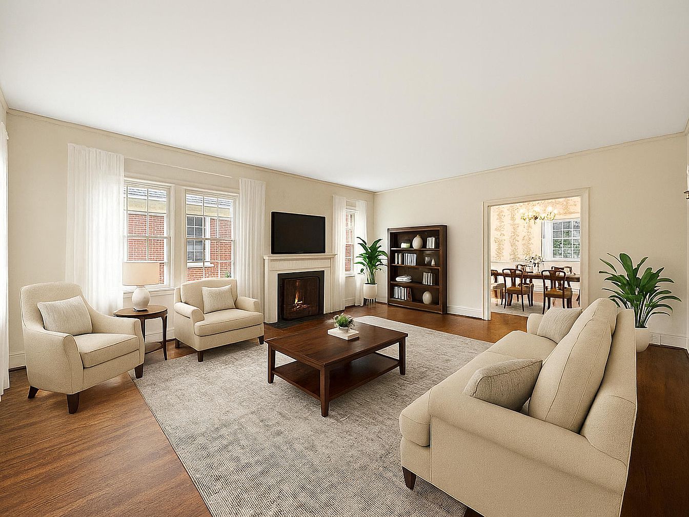 This cozy living room features a warm and inviting layout with natural light flooding through large windows, adorned with sheer white curtains. The neutral beige color palette creates a serene ambiance, complementing the rich brown hardwood flooring. A plush area rug anchors the space, enhancing comfort. Two cream-colored armchairs are paired with a simple wooden coffee table, fostering conversation. A sleek entertainment unit with a mounted television and a classic fireplace add modernity while maintaining the room’s historic charm. Lush green plants in corners introduce a touch of nature, while a view into a dining area hints at connectivity.