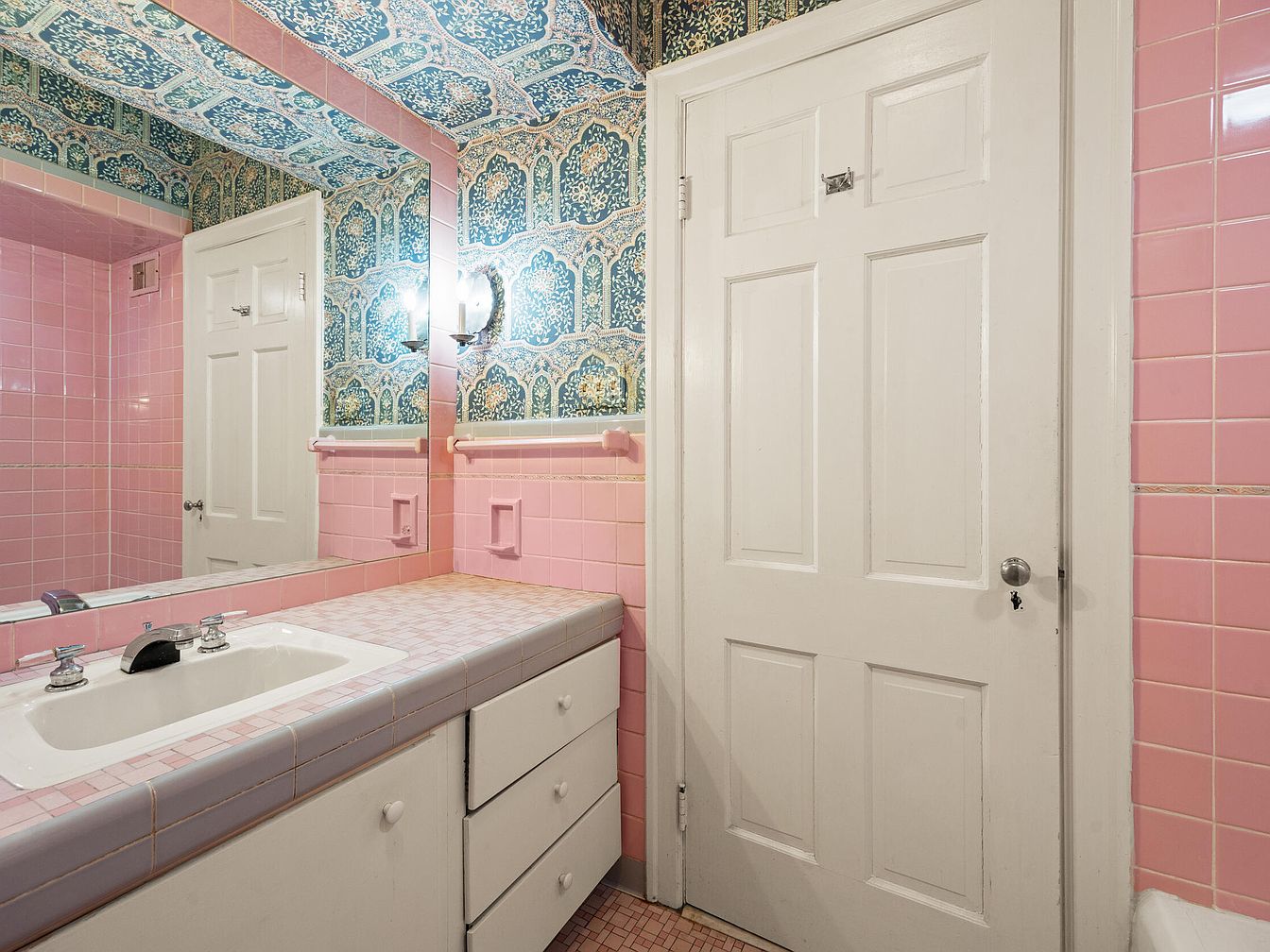 This vintage bathroom features an enchanting blend of colors and patterns. The walls are adorned with detailed, blue-and-gold patterned wallpaper, contrasting beautifully with the soft pink tiles that cover the lower half. A white vanity with a pink-tiled countertop houses a centrally positioned, rectangular sink equipped with dual chrome faucets. To one side, a large mirror reflects the room’s vibrant details. The cabinetry maintains a clean, minimalist aesthetic with simple round knobs. A classic white door, enhanced by subtle paneling, leads to the outside. The overall vibe feels nostalgic, reminiscent of mid-20th-century design.
