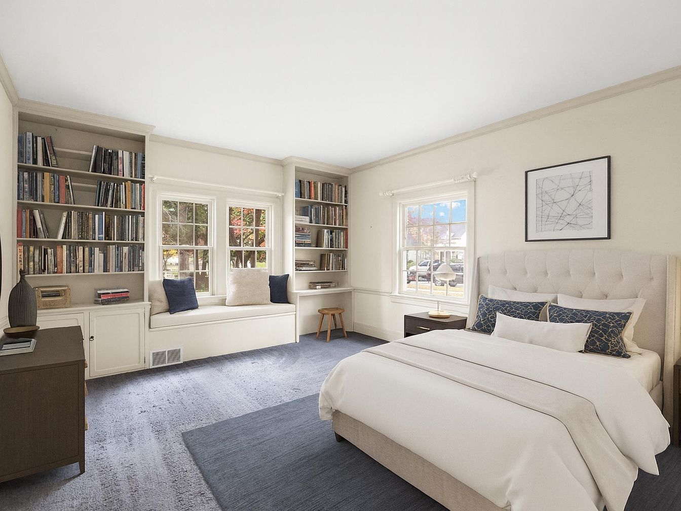This serene bedroom features a pastel color palette, with soft beige walls enhancing a sense of calm. A plush bed is centered against the wall, adorned with decorative pillows in shades of navy and white. Flanking the bed are modern nightstands, each topped with stylish lamps that provide warm lighting. A cozy reading nook is situated beside the window, complete with built-in bookshelves filled with neatly arranged books and blue cushions for comfort. The room’s soft carpeting adds a touch of warmth underfoot, and natural light floods through the large windows, illuminating the tranquil space.