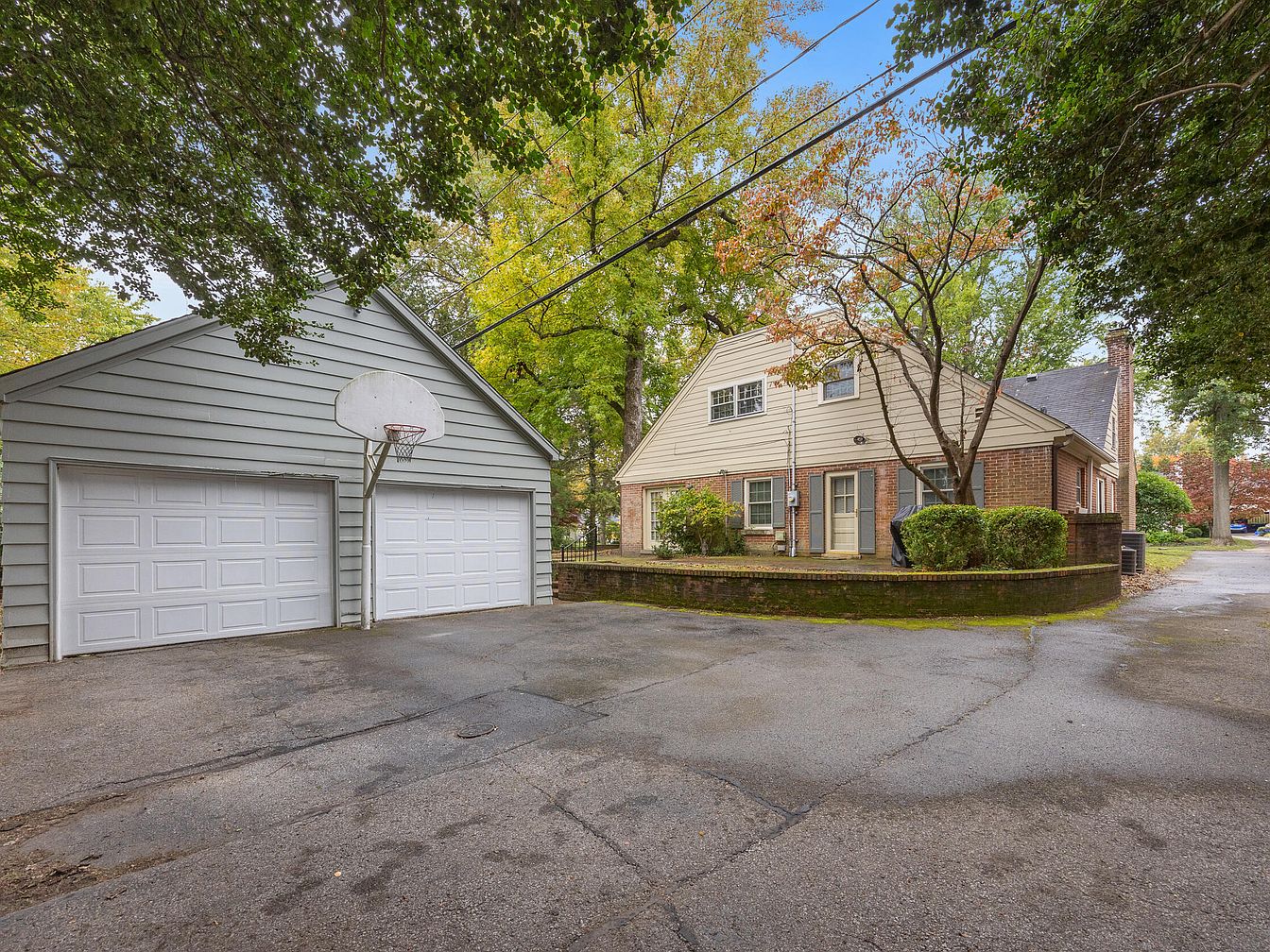 A charming view of a historic American home and its adjacent garage. The home features a combination of brick and siding in muted earth tones, enhanced by lush greenery from surrounding trees. A welcoming front porch integrates a plant bed, while large windows allow natural light to flood inside. The garage presents a functional design with white doors and a basketball hoop mounted on the side, indicating a playful family environment. The gravel driveway leads to a well-maintained path, subtly highlighting the architecture’s angular rooflines and contributing to a balanced, inviting exterior aesthetic.