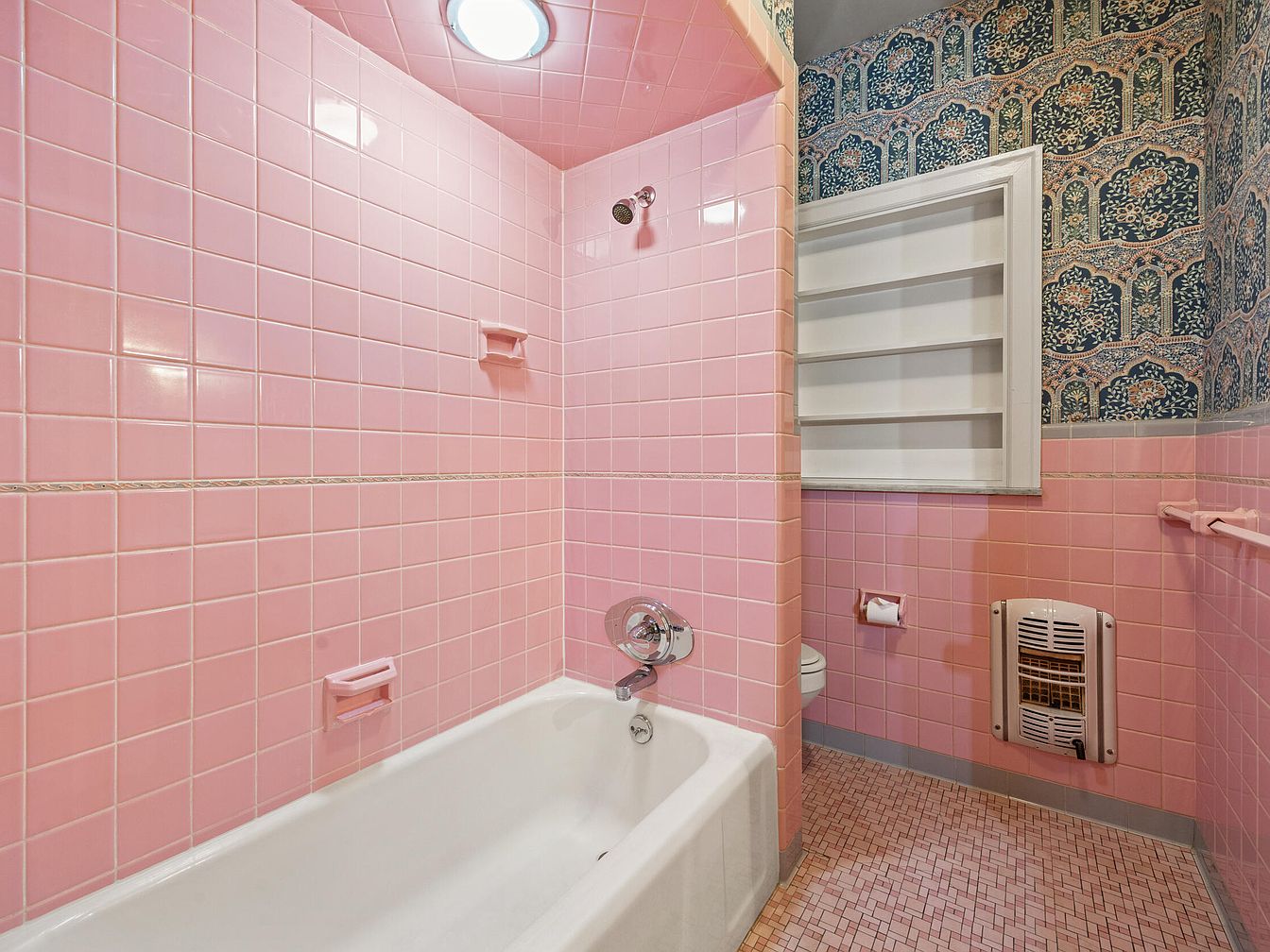 This vintage bathroom features vibrant pink tiles adorning both the walls and the shower area. A pink tub with subtle curved edges sits along the far wall, complemented by shiny chrome fixtures. The color scheme radiates a soft, nostalgic charm, enhanced by delicate white accents around the bathtub and throughout the room. A patterned wallpaper above the tiled section introduces a lush blue and floral motif, adding depth and character to the space. The flooring is a mosaic of light pink and cream tiles, while a slim shelf and pink towel holder provide practical touches, balancing functionality with retro aesthetics.