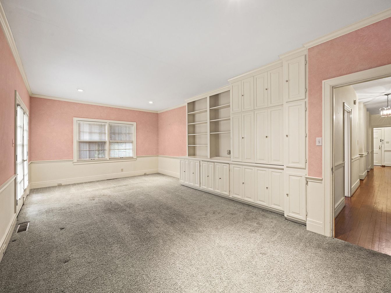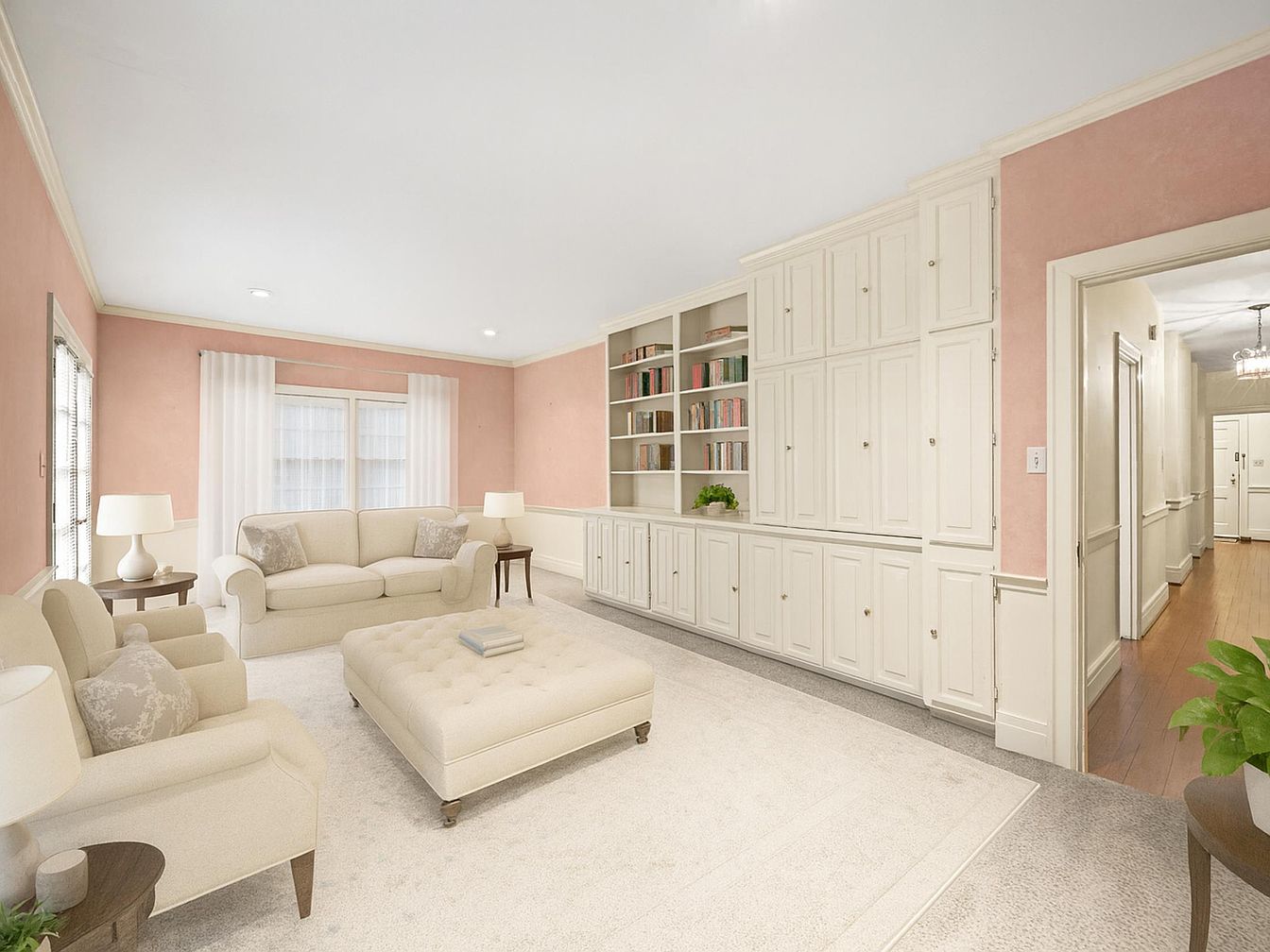 This living room showcases a soft, muted pink paint along the walls, complemented by white wainscoting that adds a classic touch. Natural light filters through dual windows adorned with white blinds, creating an inviting atmosphere. The carpet is plush and neutral, enhancing the comfort of the space. A built-in cabinetry extends along one wall, featuring elegant, simple lines and discreet hardware that seamlessly blend with the room’s aesthetic. The ceiling remains bright and airy, contributing to an open feel, while subtle architectural details reflect the home’s historic charm. A hallway leads to additional rooms.