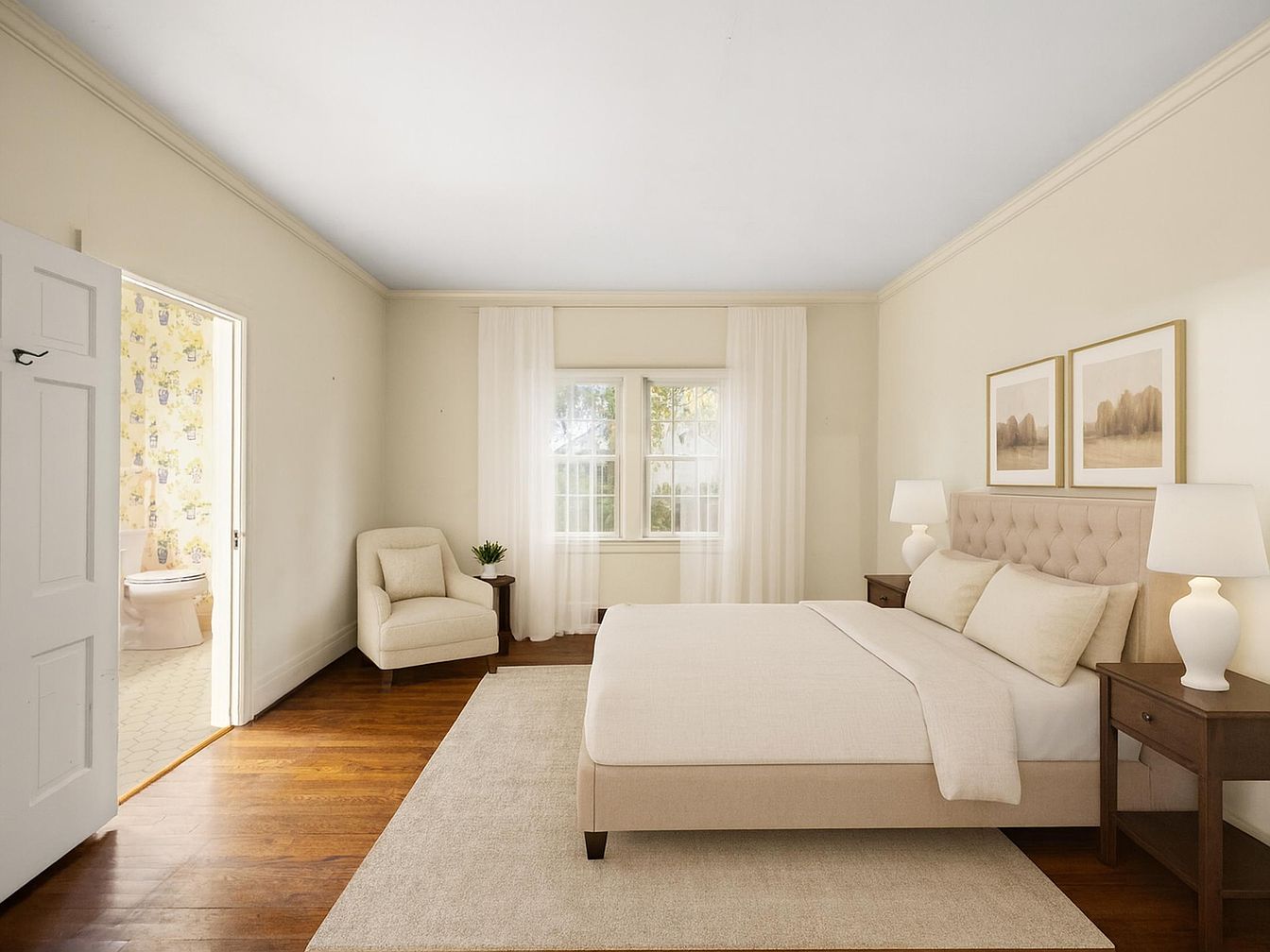 This serene bedroom features a soft, neutral palette with light beige walls and light wooden flooring, creating a calm atmosphere. The centerpiece is a plush, light-colored bed with a tufted headboard, accompanied by matching bedside tables topped with elegant white lamps. A cozy, cream-colored armchair sits in one corner, inviting relaxation. Natural light floods the room through a large window adorned with sheer curtains, enhancing the airy feel. Distinctive artwork hangs above the bed, adding subtle character. An open doorway reveals a glimpse of a chic bathroom accentuated with playful yellow wallpaper, contributing to the room’s overall charm.