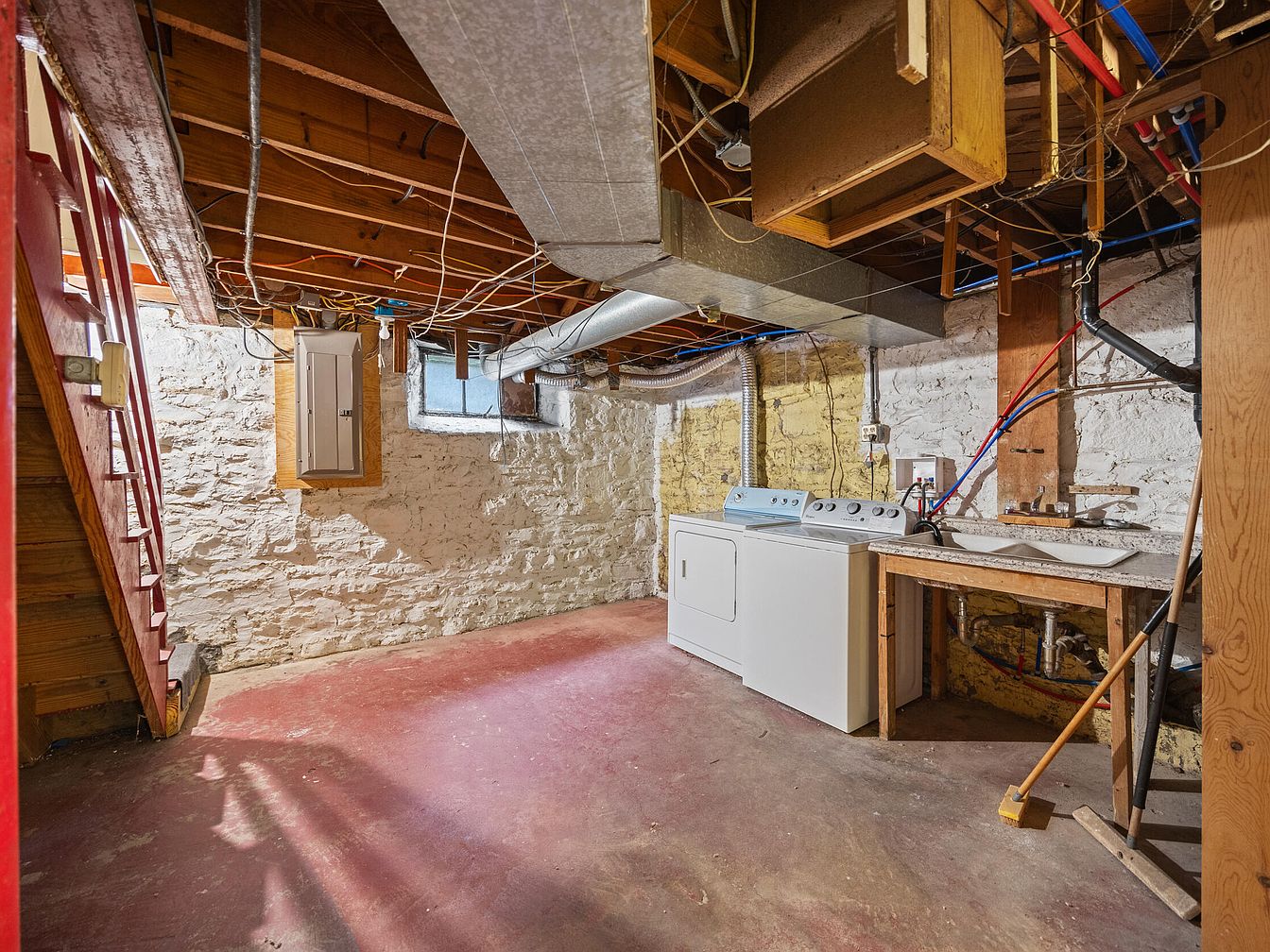 A modest basement laundry area with exposed wooden beams and utility piping overhead. The walls are made of rough, white stone, reflecting a raw and unfinished aesthetic, while the floor has a reddish concrete finish. A set of appliances, including a washer and dryer, is positioned next to a rustic wooden countertop with a sink. Natural light enters through a small window, casting shadows on the floor. An unfinished quality is present due to visible plumbing and electrical elements along the walls and ceiling, giving the space a practical, utilitarian charm.
