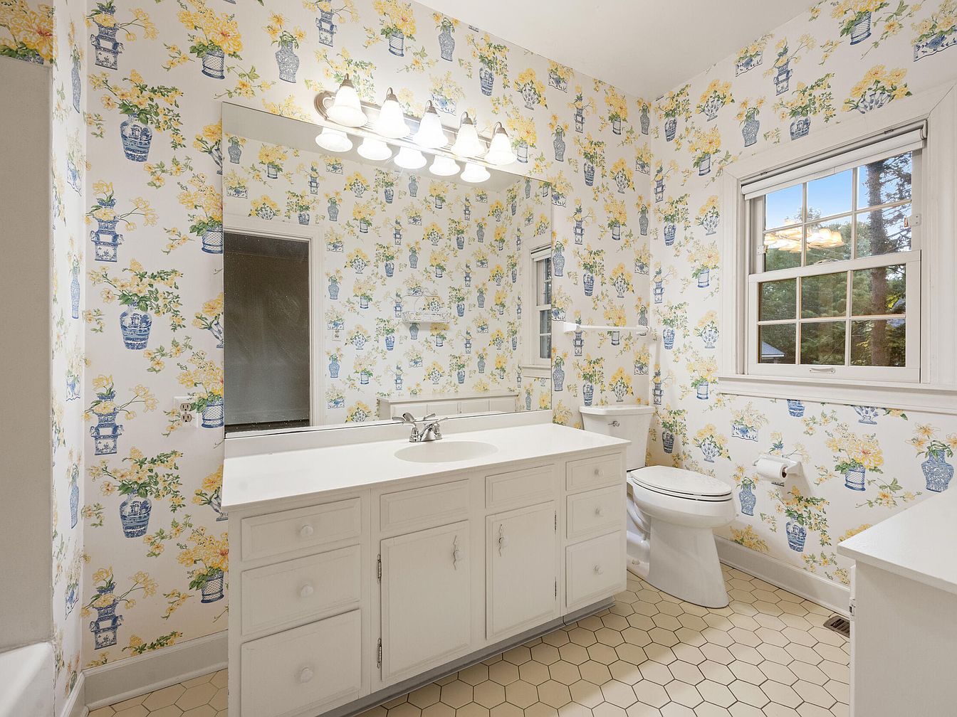 This bathroom features cheerful floral wallpaper adorned with blue vases and yellow flowers, creating a fresh and inviting atmosphere. A large mirror reflects the light from a modern five-bulb fixture above the sink. The white vanity contrasts with the colorful pattern, equipped with drawers for storage. Hexagonal tiles in a soft hue cover the floor, complementing the overall design. A window offers natural light and views of greenery outside. A white toilet and matching fixtures maintain a cohesive aesthetic. The layout emphasizes functionality while incorporating charming details, making the space both practical and delightful.