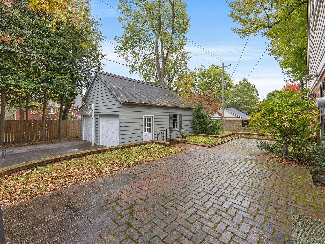 The view showcases a charming garage, designed in a classic American style, featuring a muted gray exterior with horizontal siding. It has a peaked roof adding to its rustic appeal. The garage doors, painted white and slightly recessed, evoke a sense of elegance. Surrounding the structure, a paved driveway made of brick is visible, exhibiting a herringbone pattern, creating visual interest. Lush greenery from nearby trees frames the scene, including vibrant foliage hinting at autumn. The area is calm and inviting, suggesting a functional yet aesthetically pleasing part of the property.