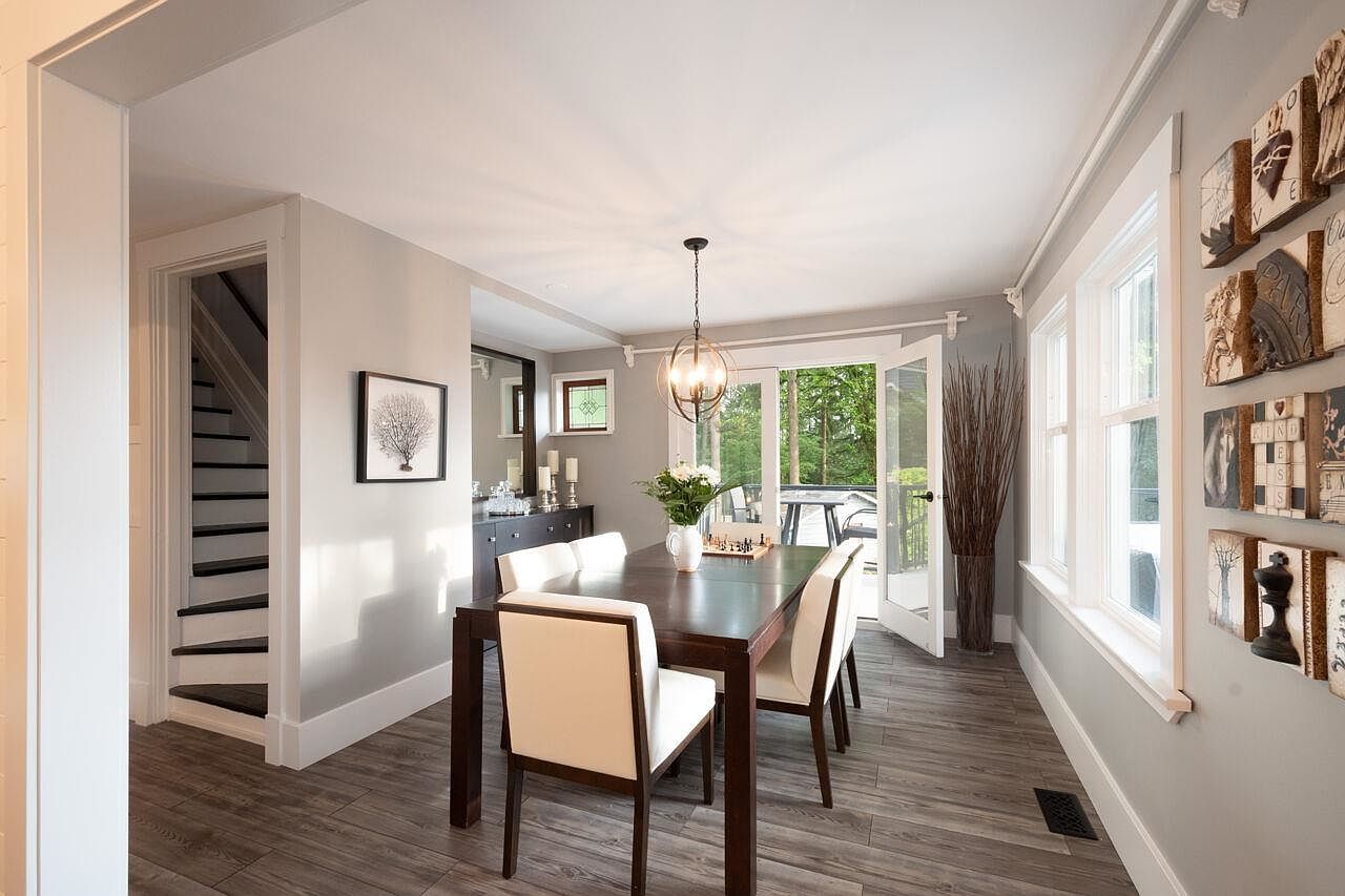 A rectangular dark wood table anchors the space, surrounded by six cream-colored upholstered chairs with sharp modern lines. The floor is covered in wood-grain planks with a soft, earthy gray finish. A spherical glass and black metal chandelier hangs above the table, casting a diffused pattern on the ceiling. Decorative touches include a tall vase with white flowers in the table’s center, wall-mounted framed art, and a textured installation of square wood plaques beside the windows. Large, double glass doors and ample windows fill the room with natural light and offer tree-filled outdoor views, creating a tranquil, inviting atmosphere.