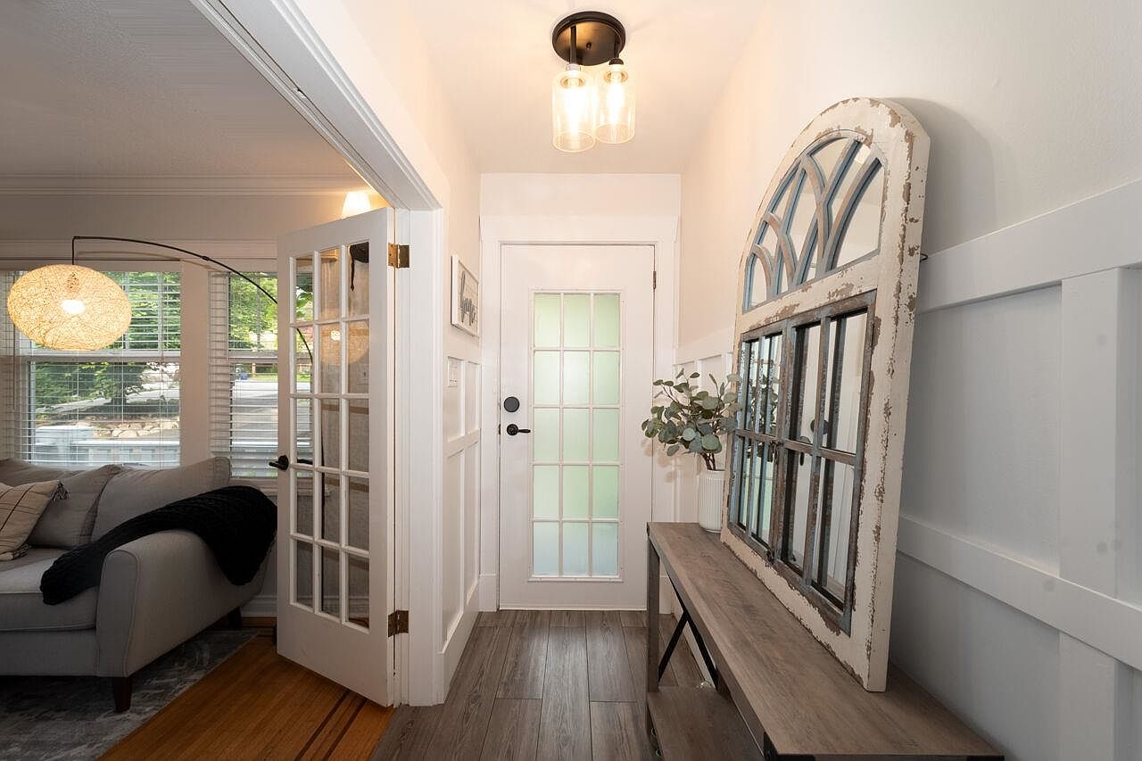 This narrow entryway features a white wooden door with frosted glass panels that allows natural light to filter through, adding brightness to the space. The walls are painted in a soft cream color and feature board-and-batten detailing that adds texture and historic charm. A rustic, distressed window frame mirror is propped on a natural wood console table, bringing a touch of farmhouse style. A small vase with greenery rests on the table, adding a fresh element. The flooring is a medium-toned wood laminate, and overhead, a modern two-bulb fixture casts a warm glow. Adjacent is an open French door leading to a cozy sitting area.