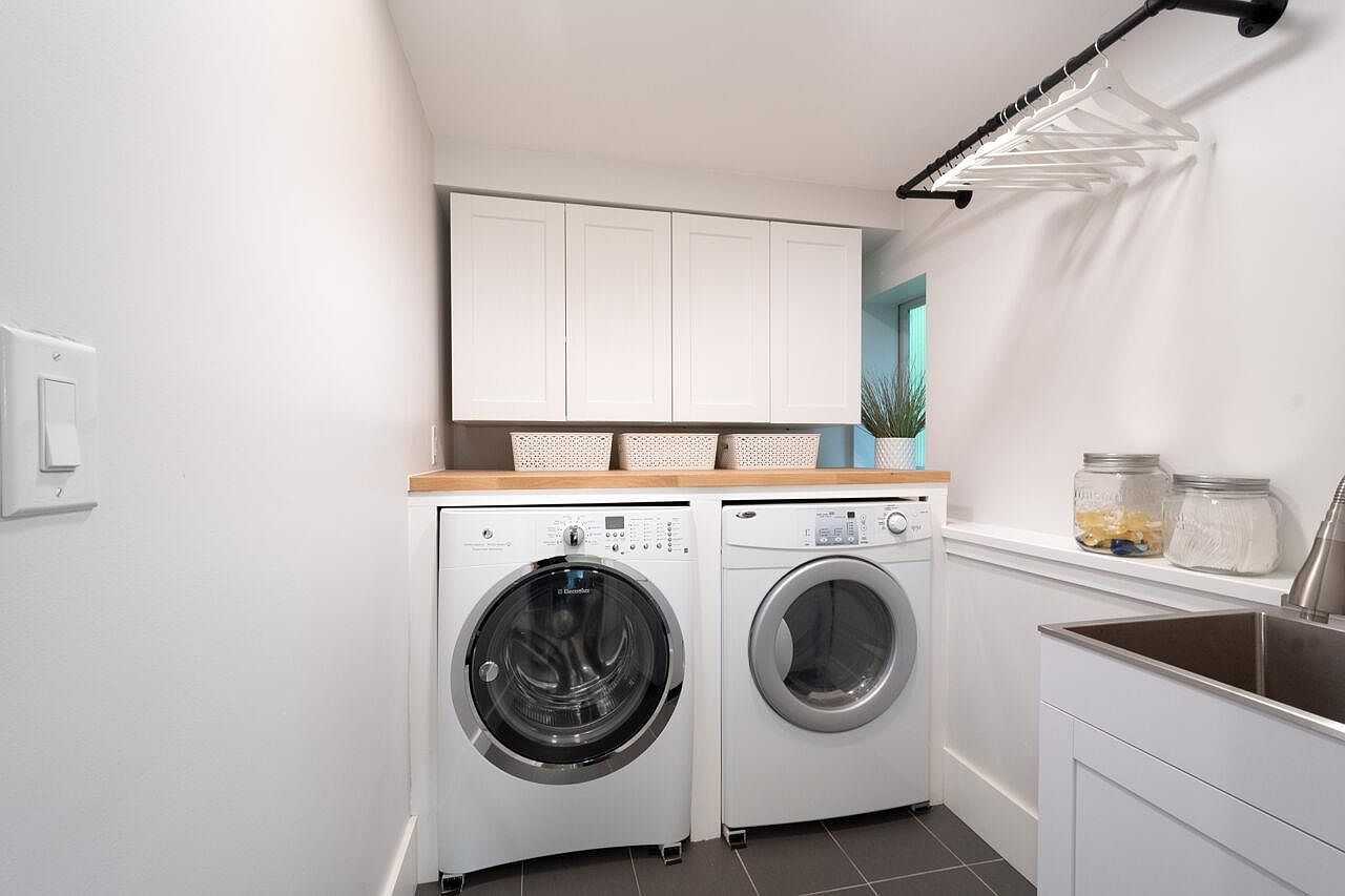 Compact, efficient laundry room with a modern, clean aesthetic. Front-loading washer and dryer are placed side by side under a butcher block countertop. Above the machines, three white woven baskets sit atop the counter for organization, with white cabinetry providing additional storage overhead. To the right, a stainless-steel sink is built into a white cabinet. A sturdy black rod with white hangers offers drying space along the wall. The color palette features bright white walls and cabinetry paired with a light wood countertop and gray floor tiles. Clear storage jars and a small potted plant add subtle decorative touches.