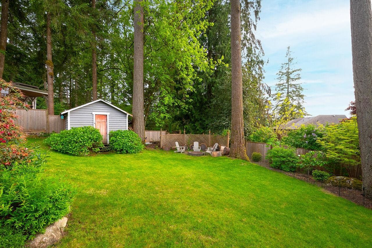A spacious backyard features a lush, well-maintained lawn bordered by vibrant green shrubbery and mature trees, creating a private, natural atmosphere. To the left stands a small gray shed with white trim and a weathered red door, surrounded by greenery. In the corner of the yard, a cozy firepit area with several white Adirondack chairs sits atop a stone circle, inviting outdoor gatherings. A wooden fence encloses the yard, providing seclusion while blending seamlessly with the rustic outdoor setting. The space exudes tranquility with ample sunlight and a harmonious balance of forest and landscape elements.