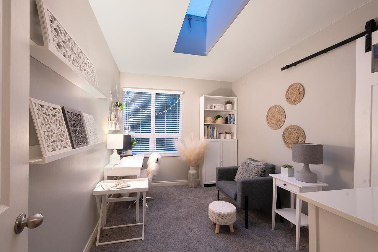 A bright workspace combines modern and cozy design elements. Natural light streams in from a wide window dressed in white blinds, accented by fairy lights. A skylight overhead adds to the airy ambiance. The main wall features floating shelves with intricate, white and grey carved panels. Below, a sleek white desk with a plush fur chair sits beside a table lamp. Against the opposite wall stands a gray armchair with a fluffy pillow, paired with a knitted pouf ottoman. A console table holds a gray lamp and small succulent. Neutral tones dominate, with cozy beige carpet, minimal accents, and woven wall hangings.