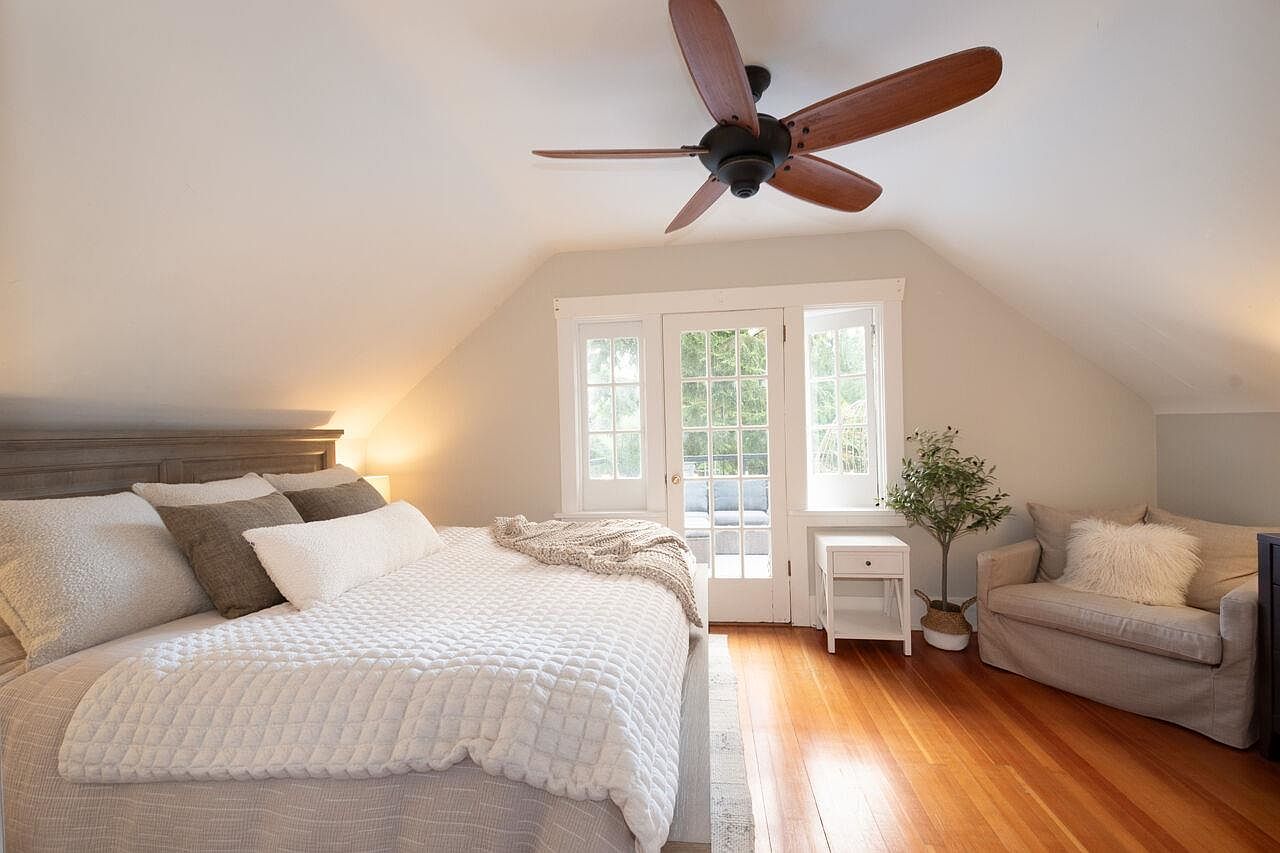 A cozy attic bedroom features a sloped ceiling and soft neutral wall colors, creating a tranquil atmosphere. A large bed made up with a textured white comforter and an assortment of plush pillows sits against the left wall. Warm wooden floors add natural richness, complemented by a light area rug. On the right, a small love seat with a fluffy accent pillow and a potted plant beside a white nightstand contribute to a relaxed and inviting feel. Double French doors with divided panes lead out to a bright outdoor space, filling the room with natural light. A large ceiling fan with wooden blades centers the room.