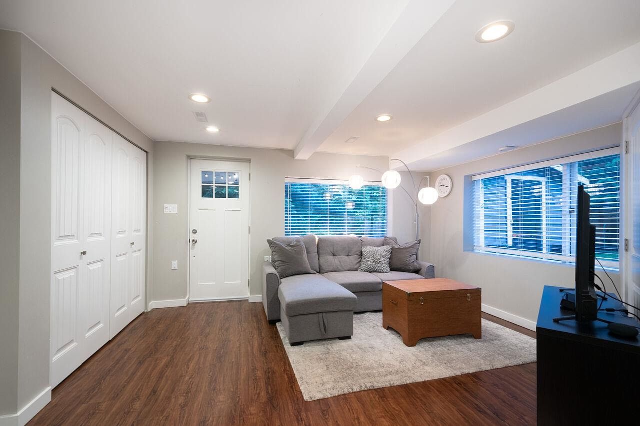This cozy living room features a large L-shaped gray sectional sofa positioned on a soft, neutral area rug. Dark wood flooring lends warmth to the space, contrasted by light taupe walls and a white ceiling with recessed lighting. Two sizable windows bring in ample natural light, matched with crisp white blinds, while a sleek modern floor lamp with three globe lights adds modern flair. A wooden trunk-style coffee table sits in front of the sofa. The entry door is simple and white, next to a double set of paneled closet doors, all contributing to a clean, organized ambiance.