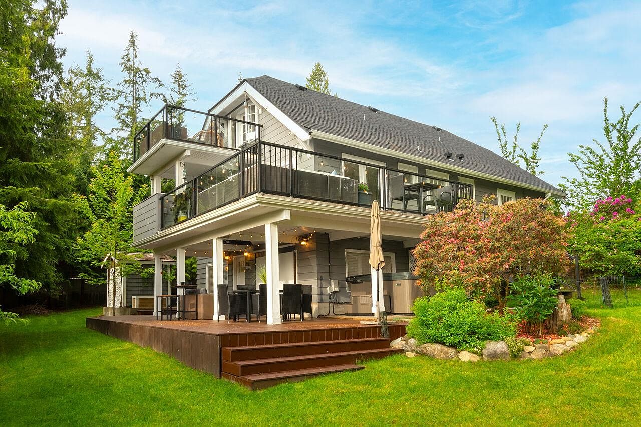 A spacious two-level backyard patio area features modern outdoor living, set against lush green grass and surrounded by mature trees and vibrant shrubbery. The upper deck has sleek, dark-framed glass railings and patio furniture, offering a place for outdoor dining and relaxation. Below, the ground-level wooden deck is partially covered, with a dining set and warm string lights, creating a cozy atmosphere. Grey siding and white columns give the architecture a contemporary feel, while landscaped garden beds and a few flowering plants soften the look, blending the house harmoniously into its green, natural surroundings.
