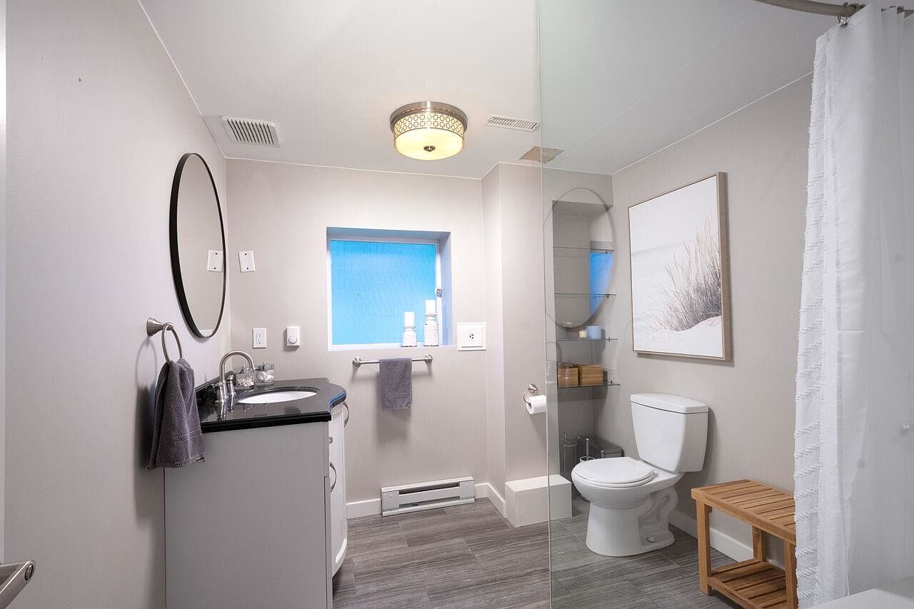 A bright and modern bathroom featuring a soft grey and white color scheme. The floor is covered in large grey tiles, complementing the pale-grey walls. To the left is a white vanity with a black countertop, topped with a circular mirror and a chrome faucet. A hand towel hangs neatly from a rack. In the center, a frosted window lets in blue-tinted light, with candles and rolled towels arranged on the sill. To the right, a white toilet sits beneath a beach-themed artwork. Glass shelves hold baskets and bathroom essentials, while a wooden bench and a white shower curtain complete the serene space.