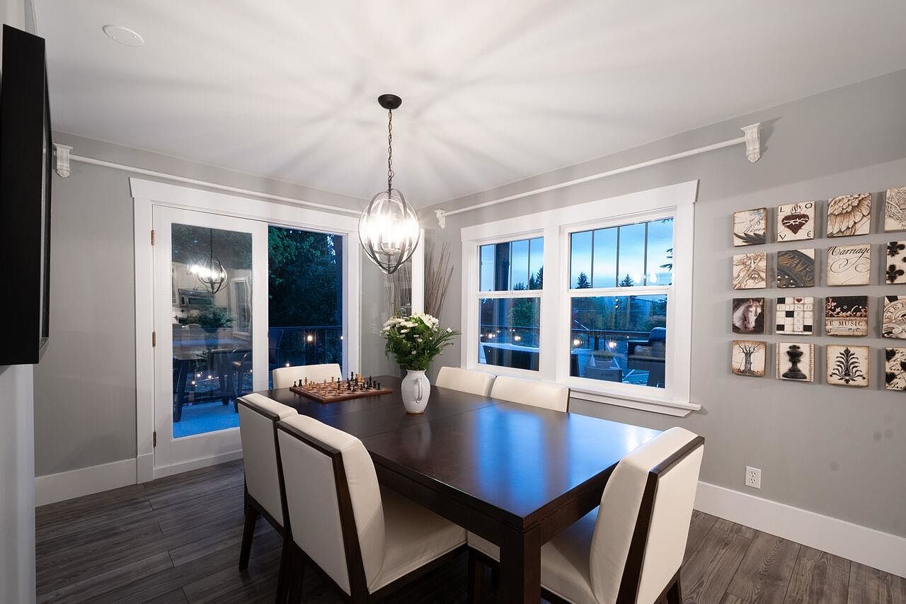 A bright, modern dining area features a dark wooden table surrounded by six white upholstered chairs with dark trim. The room has sleek gray walls with crisp white trim around the windows and French doors, which lead to an outdoor patio. A round glass pendant light hangs above the table, casting decorative shadows across the ceiling. A vase of white flowers sits in the center of the table, alongside a chess set, adding a touch of elegance and leisure. The wall is adorned with a grid of sepia art tiles displaying vintage motifs, and the floor is a muted wood grain, grounding the contemporary aesthetic.