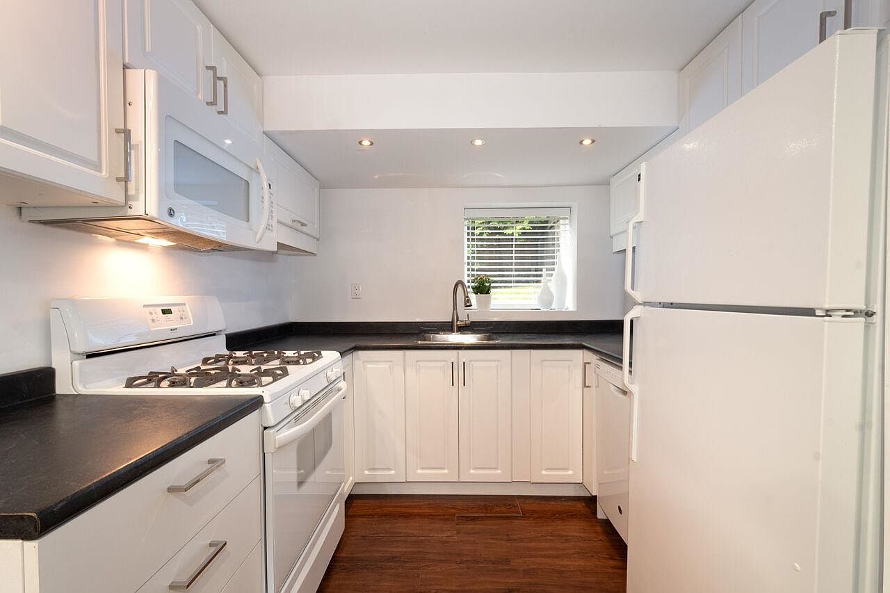 A compact U-shaped kitchen with clean, white cabinetry and modern stainless-steel handles creates a bright, airy atmosphere. The white appliances, including a gas stove, microwave, and fridge, seamlessly blend into the design. Black granite countertops provide sharp contrast and add a contemporary edge. The wooden floor introduces warmth and texture, balancing the crisp palette. Overhead recessed lighting ensures a well-lit workspace. At the center, a stainless-steel faucet and small window above the sink bring in natural light; a potted plant and white vase add a subtle decorative touch for a welcoming, functional kitchen space.