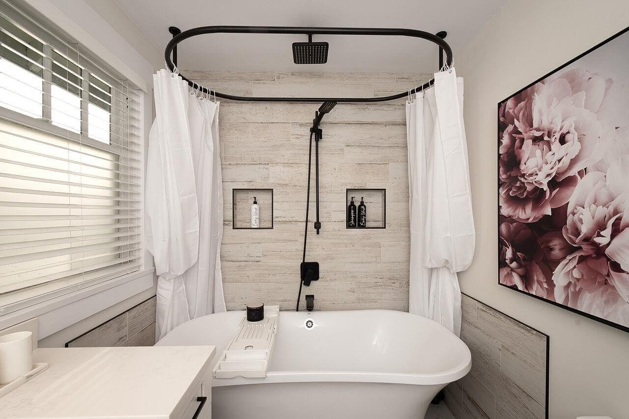 A contemporary bathroom features a freestanding white bathtub centered under a black, oval-shaped shower curtain rod fitted with white curtains. The surrounding walls are clad in light wood-style tiles, with two recessed shelves holding black and white toiletries. A modern black rainfall showerhead is mounted above the tub, complemented by a black handheld shower fixture. Natural light enters through white blinds on a window to the left, illuminating a sleek white vanity counter. On the right wall, a large floral artwork in soft pink tones adds a touch of color and elegance to the clean, neutral palette of the space.
