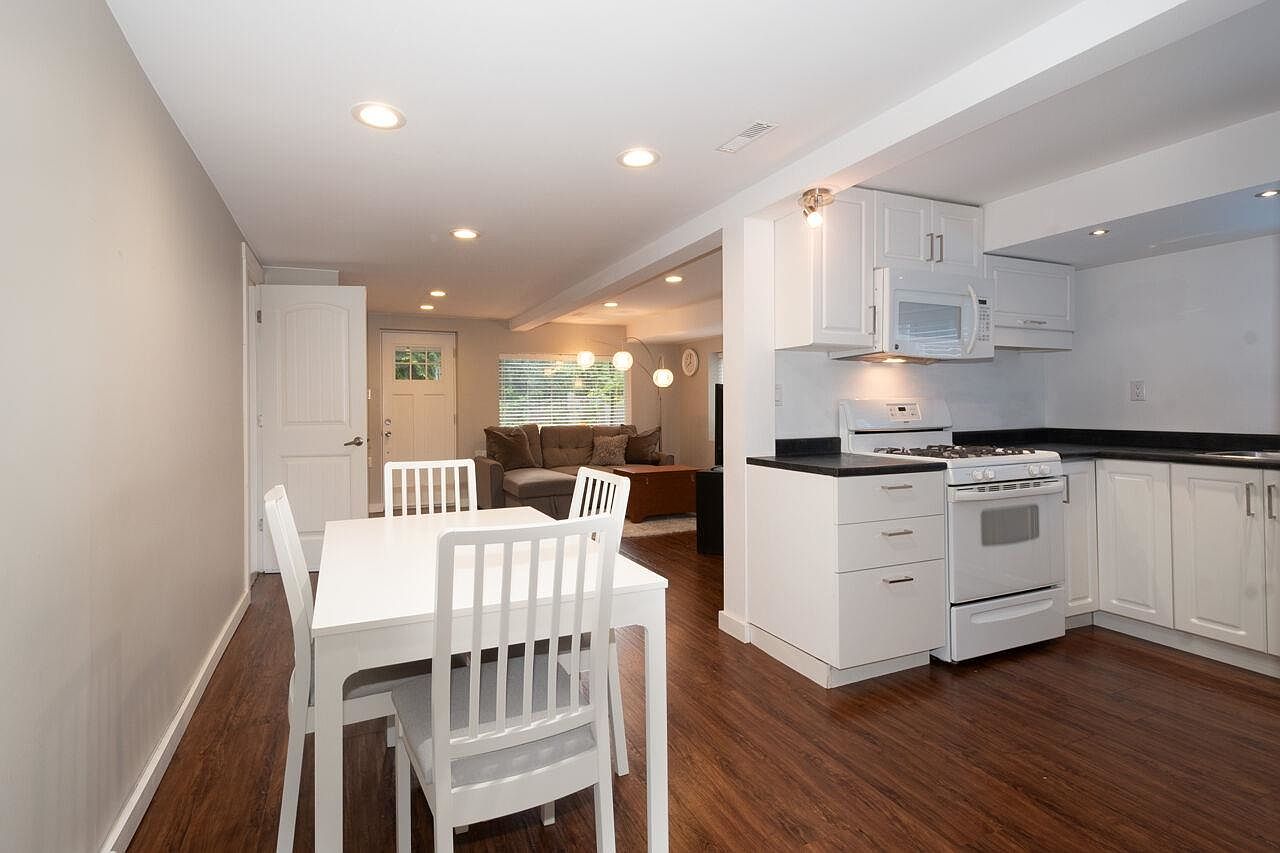 Open-concept kitchen, dining, and living space with a clean, modern aesthetic. The kitchen features crisp white cabinetry, white appliances, and contrasting black countertops. Adjacent to the kitchen, a simple white dining table with four matching chairs sits atop rich, medium-toned wood flooring, which runs seamlessly throughout the area. The living room in the background has a neutral sectional sofa, accented by soft, beige and taupe pillows, and a tripod floor lamp with three globe lights. The walls are painted light gray, and recessed ceiling lights offer balanced, even illumination. A large window and glass-paned door bring natural light to the space.