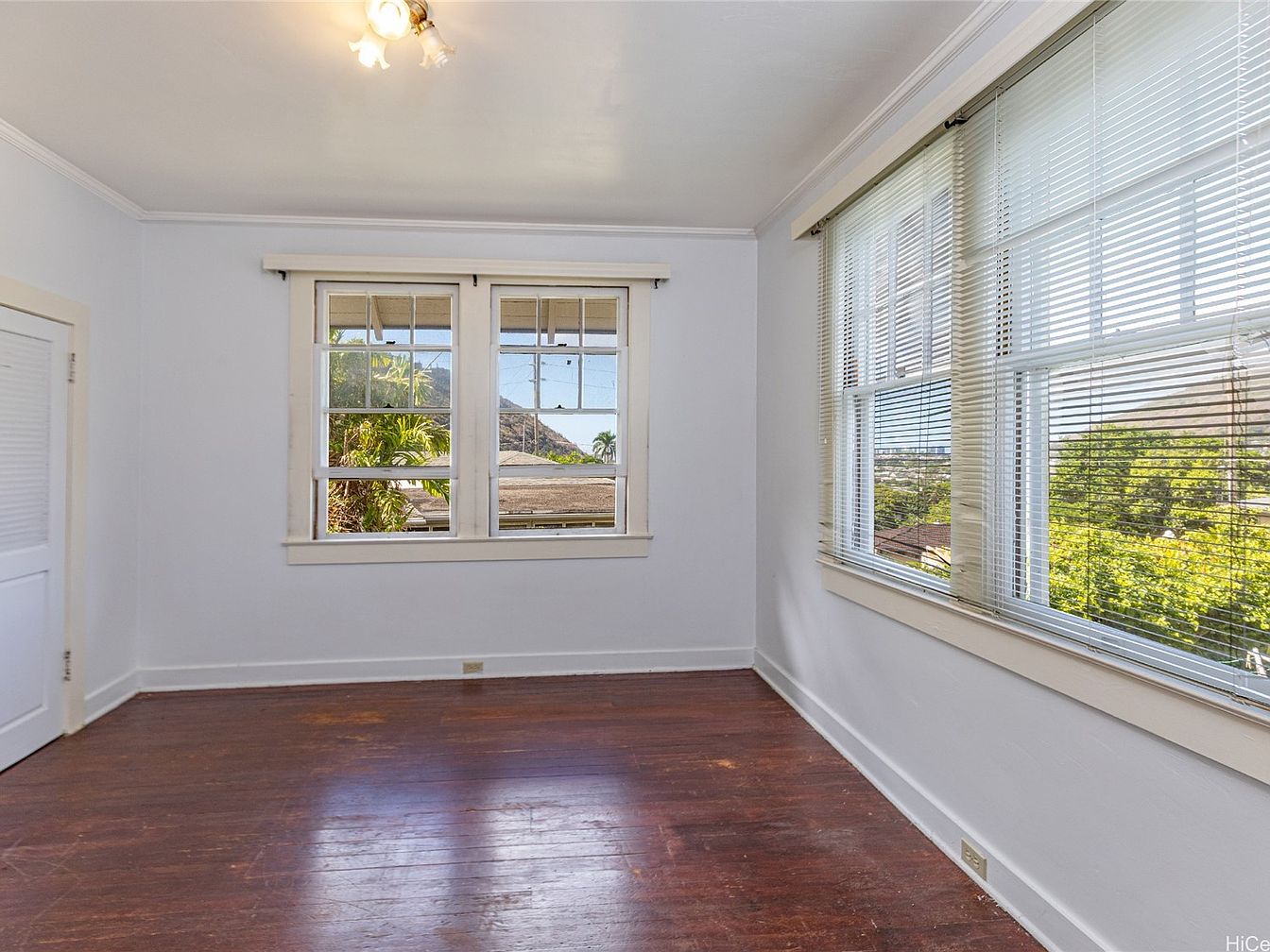 This bedroom features hardwood flooring with a rich, dark finish, adding warmth to the space. The walls are painted in a soft, light hue, creating an airy and expansive feel. Two large windows allow ample natural light, framing views of lush greenery outside. The window frames are white, enhancing the room’s brightness and contrast with the darker floor. A closed door leads to a shallow closet, with louvered doors for airflow. To the right, another door opens into a small hallway, hinting at additional spaces. Minimalistic design elements emphasize simplicity, making it a serene retreat.