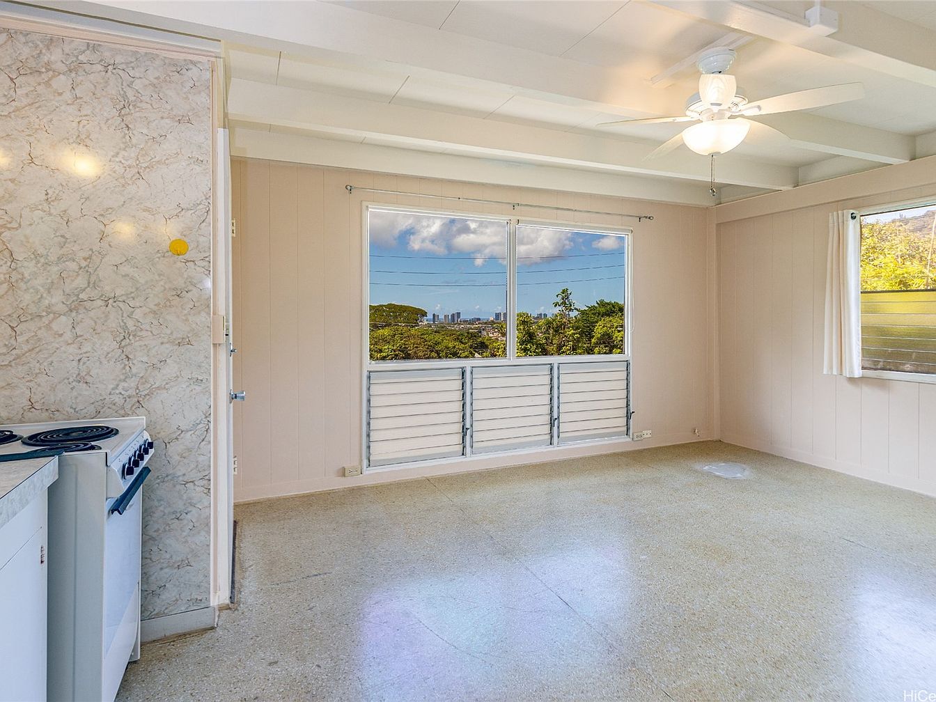 This space features a spacious layout with a light, airy feel. The walls are painted in a soft beige, complementing the creamy marble-patterned panels that frame the kitchen area. A large window captures abundant natural light, showcasing a picturesque outdoor view of greenery and distant cityscapes. The ceiling is adorned with white beams that enhance the room’s height, while a ceiling fan adds a touch of comfort. The flooring is polished and provides a subtle sheen, creating an open atmosphere for possible furnishings. Overall, the room invites relaxation and casual gatherings, reflecting a blend of modern and retro aesthetics.