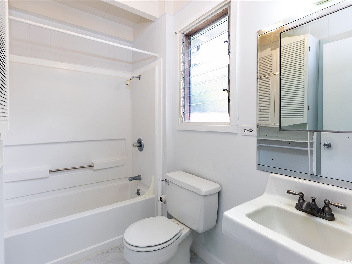 This bathroom features a simple, functional design with a clean layout. The walls are painted in a crisp white, enhancing the sense of openness. A bathtub with a shower combination is positioned against one wall, its surfaces seamlessly integrated for easy maintenance. The toilet, also in white, complements the tub. A modern sink with bronze fixtures provides a stylish contrast against the light backdrop. Natural light filters in through a window, illuminating the space. A mirrored cabinet adds storage and depth without cluttering. Overall, the aesthetic is minimalist and bright, emphasizing cleanliness and practicality.