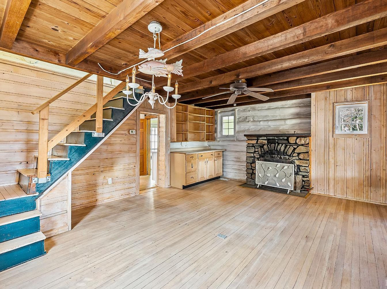 This cozy living room features rustic wooden beams and a warm, inviting atmosphere. The walls are adorned with rustic paneling, creating a harmonious blend of natural textures. A central stone fireplace anchors the space, complemented by a decorative screen featuring an etched design. Opposite the fireplace, a kitchen area showcases light wood cabinetry, while the open layout ensures easy flow. A wooden staircase with blue accents leads to the upper level, enhancing the charm. Light floods in through small windows, illuminating the polished wooden floor, conveying a sense of comfort and timelessness in this historic home.
