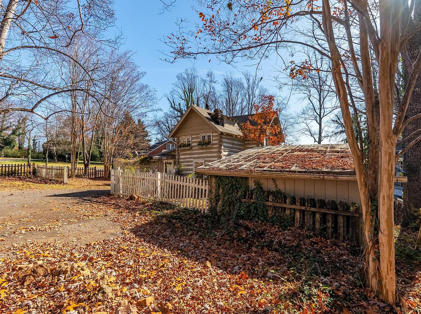 This scene showcases a charming garden area surrounding a historic American home. The lawn is covered in a carpet of fallen autumn leaves, offering a warm palette of browns and golds. Patches of greenery peek through between the leaves, while a white picket fence outlines the property, adding a nostalgic touch. The house features a combination of log and traditional siding, highlighting its historic character. Tall, bare trees with delicate branches frame the scene against a clear blue sky. The overall aesthetic radiates a cozy, rustic ambiance, evoking a sense of peace and connection to nature.