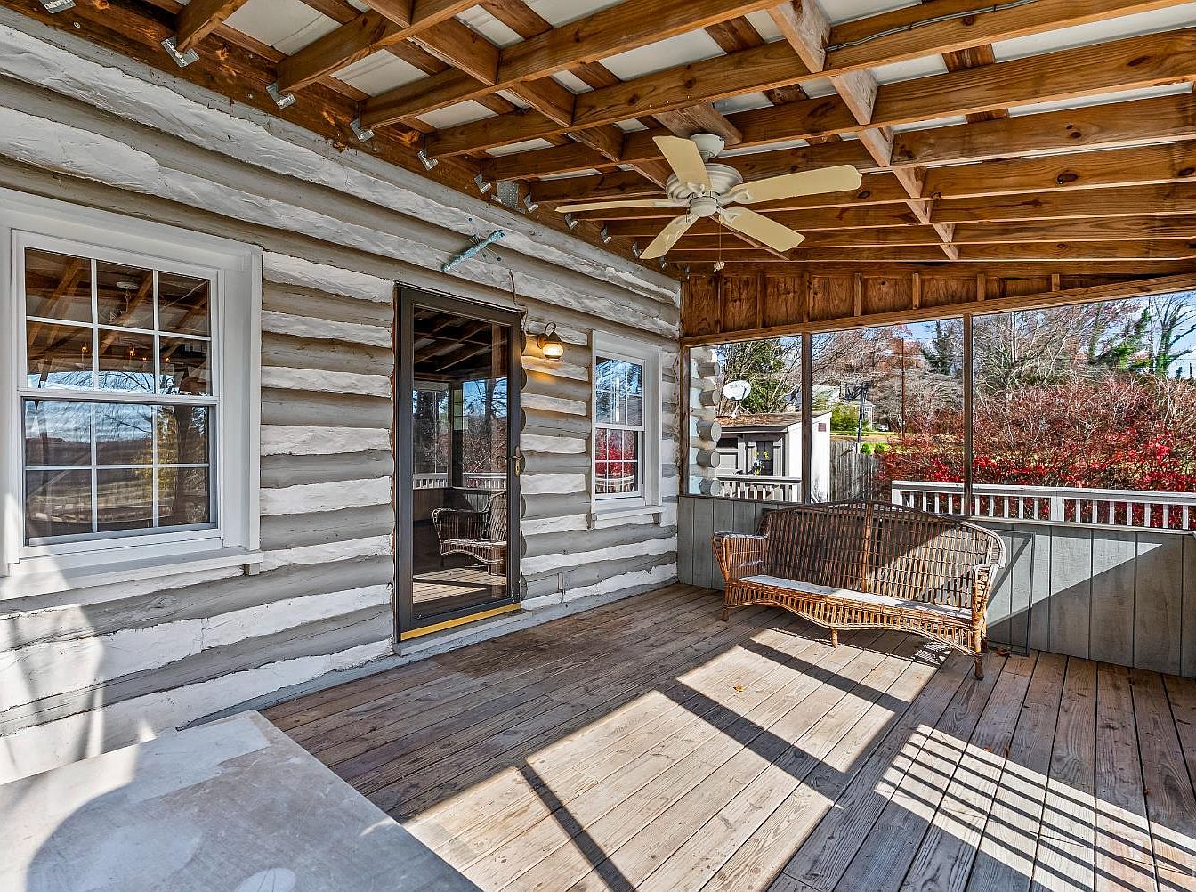 This exterior space features a spacious wooden deck with a light, weathered finish, enhancing the rustic charm of the home. A section is screened in, providing a welcoming transition from the outdoors, ideal for lounging or dining. The house displays a mix of log and traditional siding, showcasing a blend of textures that add character. The sloped roof and prominent chimney contribute to its historic feel. Adjacent is a secondary structure with a classic door, echoing the home’s architectural style. Surrounding trees provide natural privacy, while the blue sky above creates a serene backdrop.