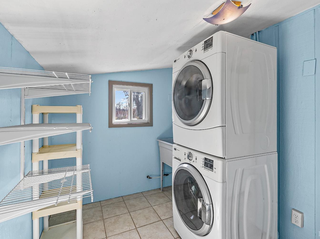 This laundry room features a practical layout with a stackable washer and dryer, maximizing space efficiency. The walls are painted a soft blue, creating a calming atmosphere, while the tiled floor maintains a clean and functional aesthetic. Adjacent to the appliances, open shelving provides ample storage for laundry essentials, encouraging organization. A small window allows for natural light, complementing the overall brightness of the room. The fixtures are modern and white, enhancing the room’s clean look. The room’s design focuses on utility without sacrificing comfort, making it a welcoming chore space in the home.