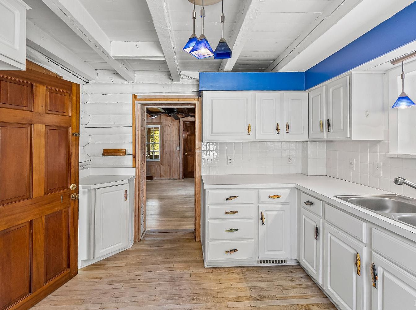 The kitchen showcases a spacious layout with white cabinetry accentuated by unique fish-shaped handles. A seamless countertop offers ample workspace, along with a stainless steel sink positioned below a window. Light pours in, illuminating the glossy tiled backsplash. The room features exposed wooden beams that enhance the rustic charm. To the left, a natural wood door invites to another area of the house, while the wooden flooring adds warmth. Above, pendant lights with blue shades create a modern touch, contrasting with the traditional elements. The blue accent wall provides a vibrant pop against the predominantly white palette.