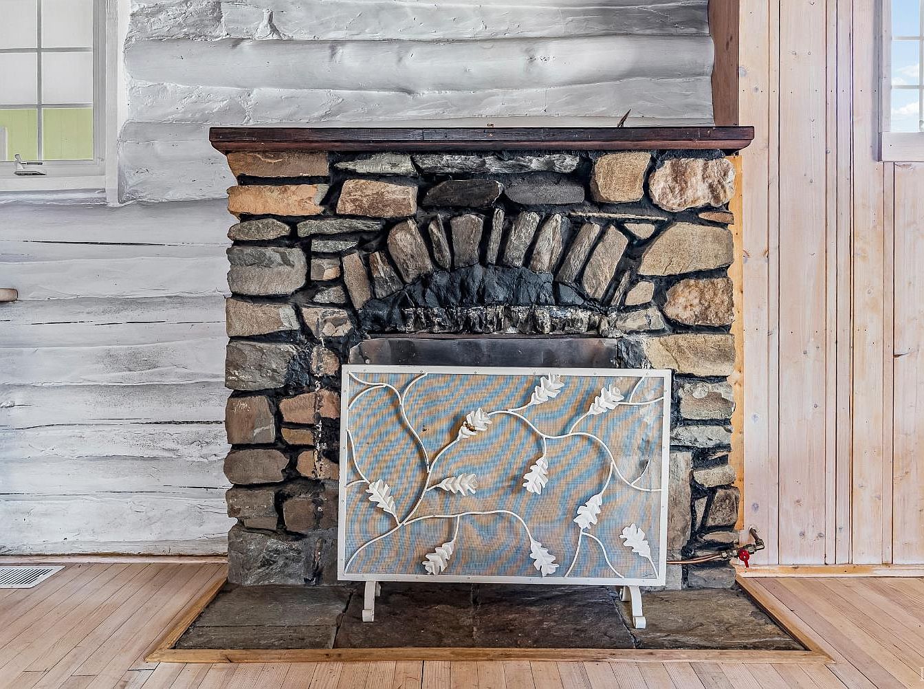The focal point is a rustic stone fireplace, showcasing an array of irregularly shaped stones in muted earth tones. The mantel, a traditional wooden beam, contrasts with the textured stone. Below, a decorative screen with a delicate leaf pattern adds a touch of elegance. The surrounding walls feature exposed wooden planks, painted in a light hue, contributing to a cozy ambiance. The flooring, made of warm hardwood, enhances the room’s inviting feel. A window allows natural light to filter through, illuminating the scene and creating a warm, homey atmosphere, perfect for relaxation and gatherings.