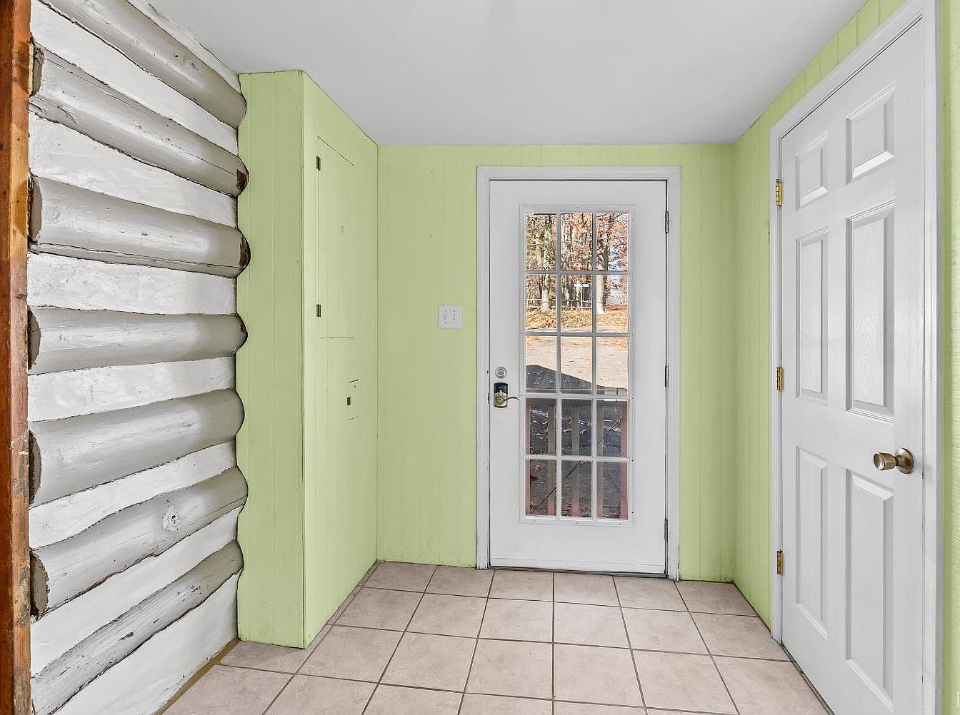 The entryway features a charming combination of log and painted walls, creating a rustic yet fresh ambiance. To the left, a textured log wall contrasts against the vibrant green sides, giving character to the space. A white, paneled door stands to the right, providing access to another area. Opposite, a set of French doors framed by natural light leads outside, enhancing connectivity with the outdoors. The floor is covered in neutral, square tiles, unifying the color palette. Clever storage solutions are integrated into the wall, maximizing functionality while maintaining an airy feel. This entryway invites guests warmly.