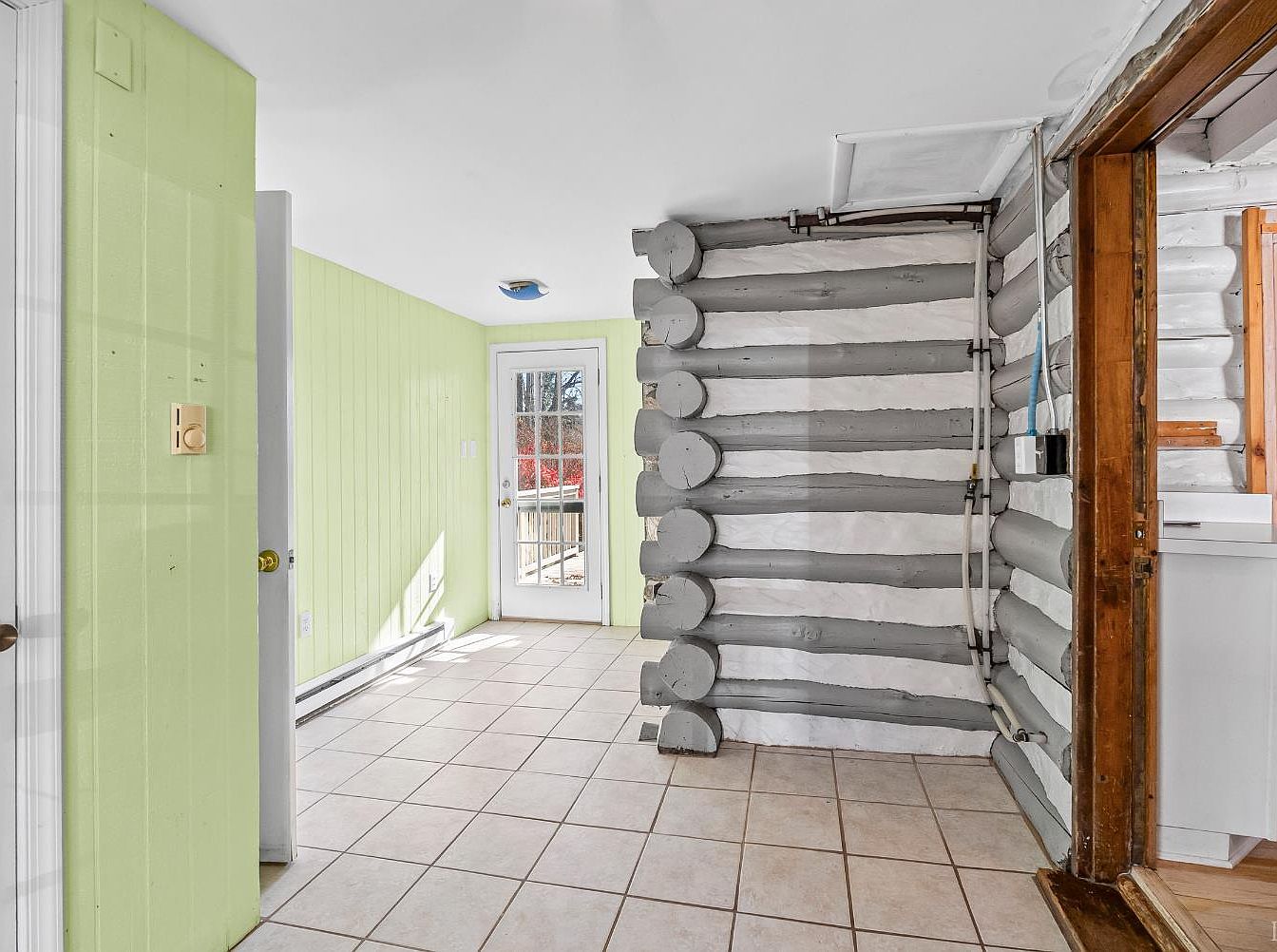 A charming entryway features a mix of log cabin elements and a modern touch. One wall showcases horizontal log beams painted in a soft gray, contrasting with the bright, fresh lime green wall on the opposite side. Natural light pours in through a glass-paned door that opens to an outdoor deck, enhancing the space’s warmth. The floor is tiled in neutral cream, providing a clean backdrop for the rustic textures. A small wooden frame around the doorway adds a hint of traditional craftsmanship. The overall aesthetic balances rustic charm with a lively, contemporary color scheme, creating an inviting atmosphere.